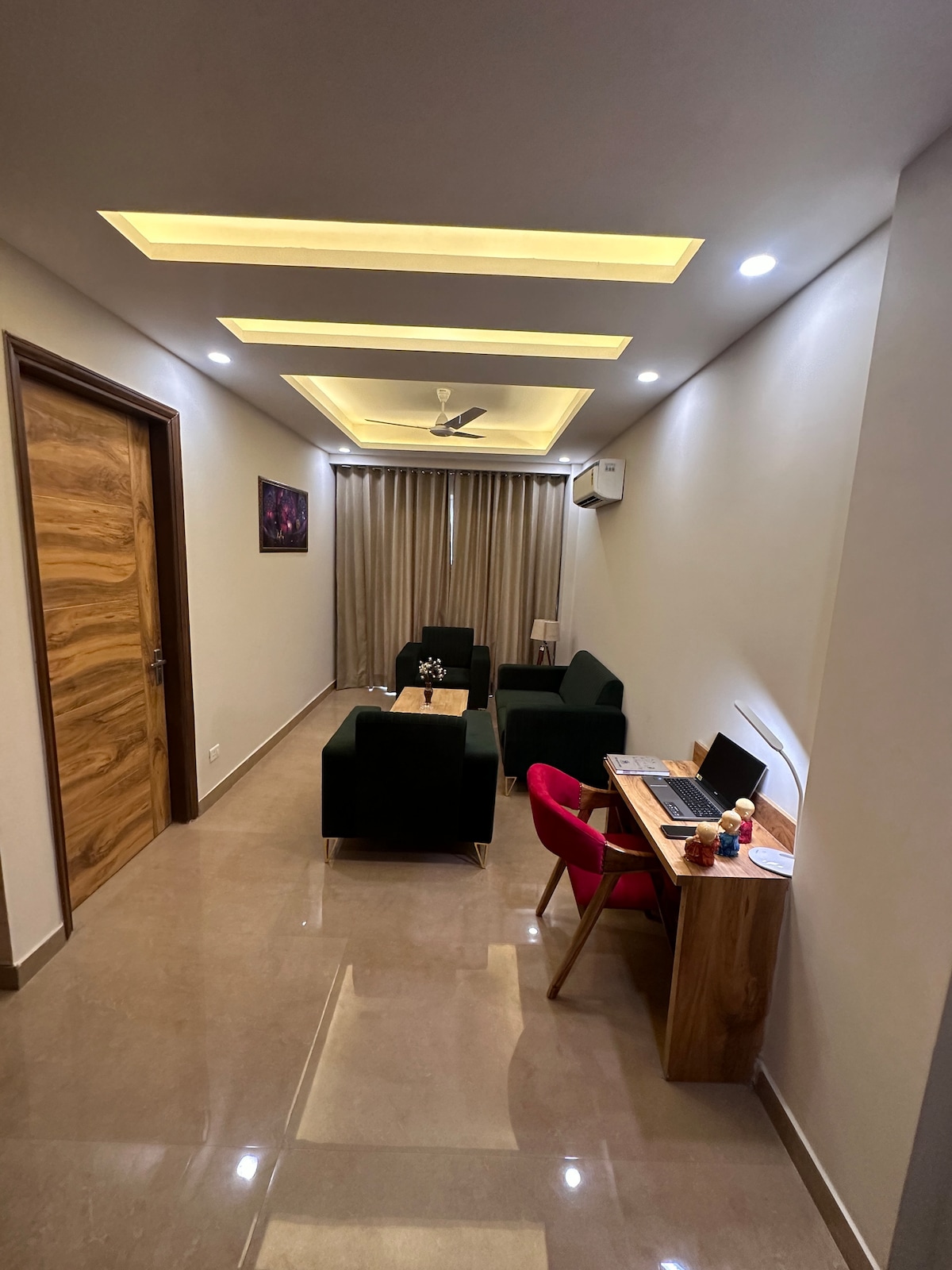 Bathed in natural light, this spacious 1BHK is a calm retreat in the heart of Gurgaon. Just a few minutes from Golf Course Road and HUDA Metro, it offers city connectivity within a quiet residential setting. • 750 sq ft open living • King bed with soft linen • Work + reading corners + space for stillness • Fully equipped kitchen Set within a family home yet fully independent, it balances privacy with nearby support. Ideal for solo travelers and long stays seeking calm without losing access.