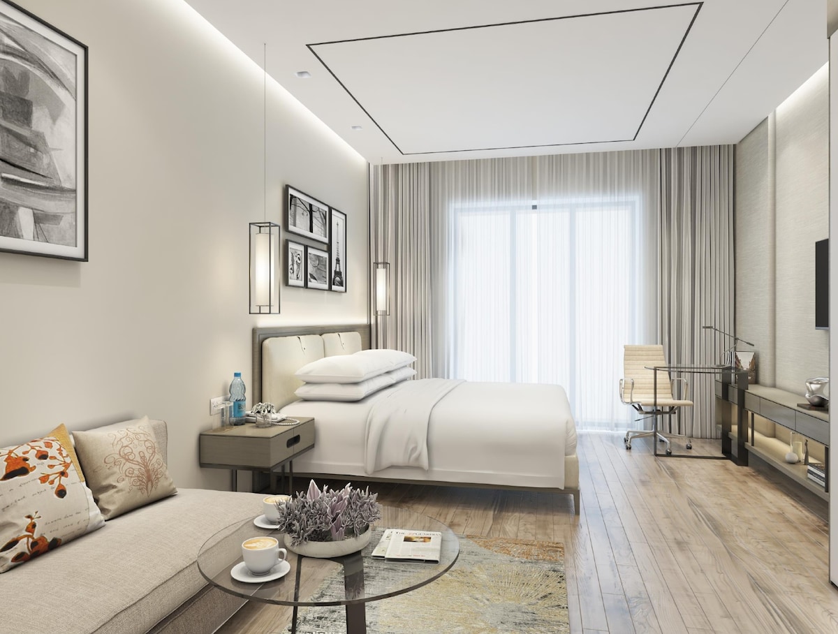 Experience comfort and style in a sanctuary designed for work and relaxation. Rest on a Wakefit orthopedic mattress and enjoy warm ambient lighting. Stay productive with an ergonomic workspace and unwind with two 42-inch TVs. The attached bathroom offers premium toiletries and a lit vanity mirror. Cook effortlessly in a fully equipped kitchen. Relax on the sofa in a space where peace, productivity, and lifestyle blend perfectly.
