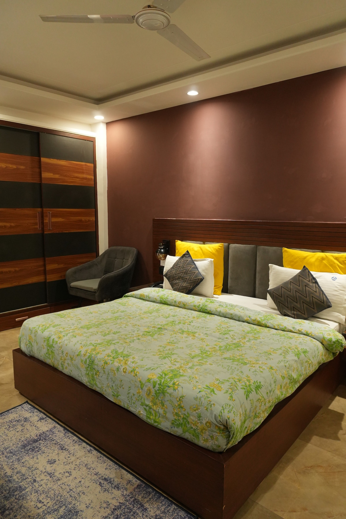 Location very serene, against the backdrop of a huge forest with a lake,peacocks,rabbits, deer presenting nature at its best. Aesthetically furnished A/C Room, attached bath & balcony, 2 minutes from market, 8 minutes from Metro. On First Floor with around 20 steps to walk upto. Breakfast is available on order and is chargeable. Laundry of clothes in the washing machine is on chargeable basis.
