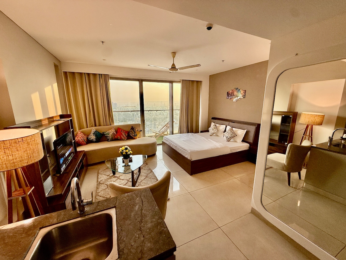 Welcome to our 16th-floor cozy studio, a serene retreat designed to be your home away from home with High Speed Wifi at Gurgaon. Enjoy the garden balcony with cozy seating, perfect for relaxing or working. The apartment offers books, TV, and comfortable low seating ideal for creating art or pursuing hobbies like painting, writing, or music. The 16-inch mattress ensures a restful sleep. Our full kitchen amenities cater to healthy eating, allowing you to enjoy this space like your own home.