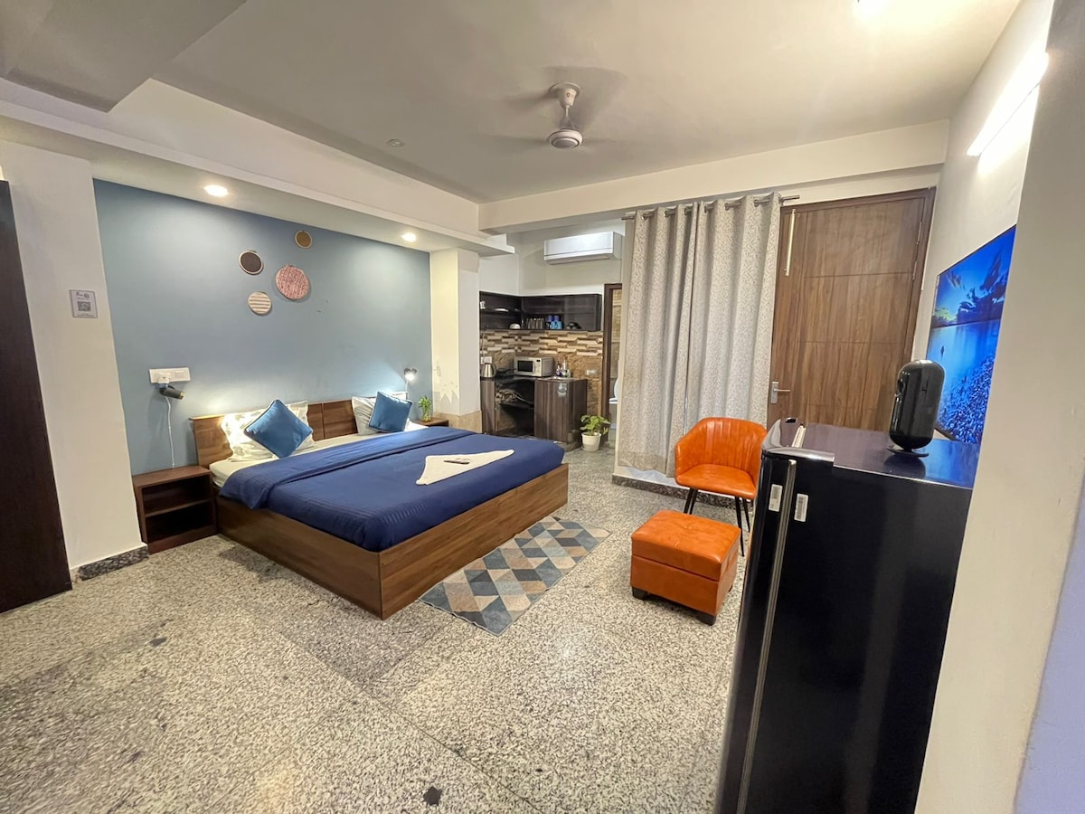 BLUO STAYS - Award-winning Homes! Awesome 1BHK Suite (550 sq ft) near Udyog Vihar, DLF CyberCity & MG Road with Lift & 100% Power Backup. Work From Home - Designer King Bed, 42" Smart TV, Bathroom & private Balcony. You also get a separate Living room with Couch & Dining Table plus Kitchen with Cooktop, Fridge, Microwave, Cookware etc. All-inclusive Daily Rentals - WiFi Internet, Netflix/Prime, Cleaning, Washing Machine, Utilities, Parking, Lift, Gym, TT, Pool Table & Terrace Garden..