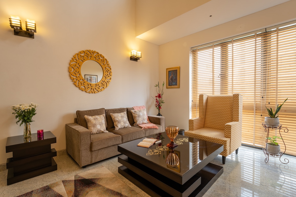 Experience comfort and style in a sanctuary designed for work and relaxation. Rest on a Wakefit orthopedic mattress and enjoy warm ambient lighting. Stay productive with an ergonomic workspace and unwind with two 42-inch TVs. The attached bathroom offers premium toiletries and a lit vanity mirror. Cook effortlessly in a fully equipped kitchen. Relax on the sofa in a space where peace, productivity, and lifestyle blend perfectly.