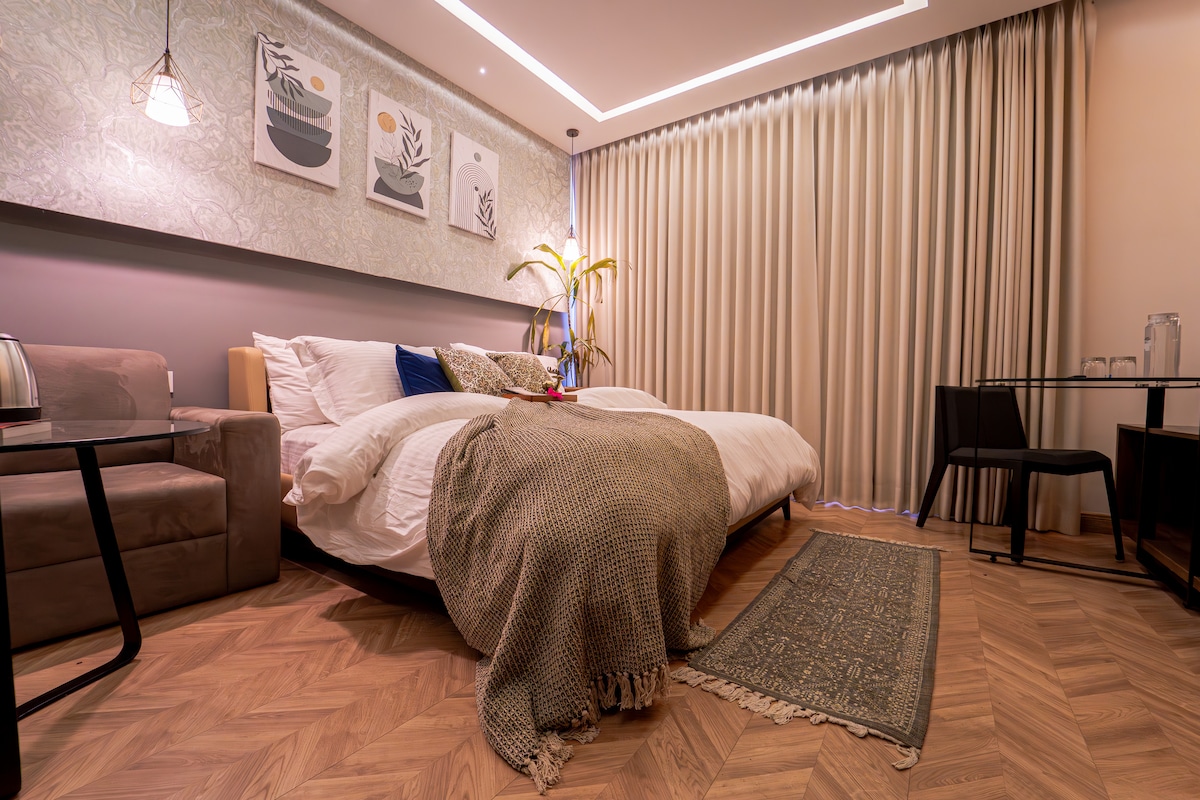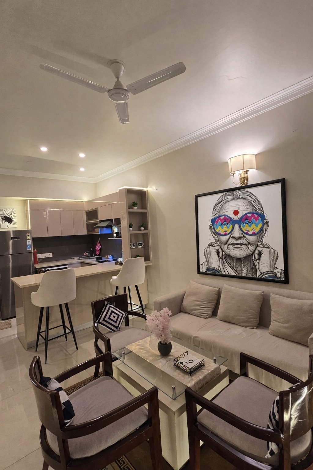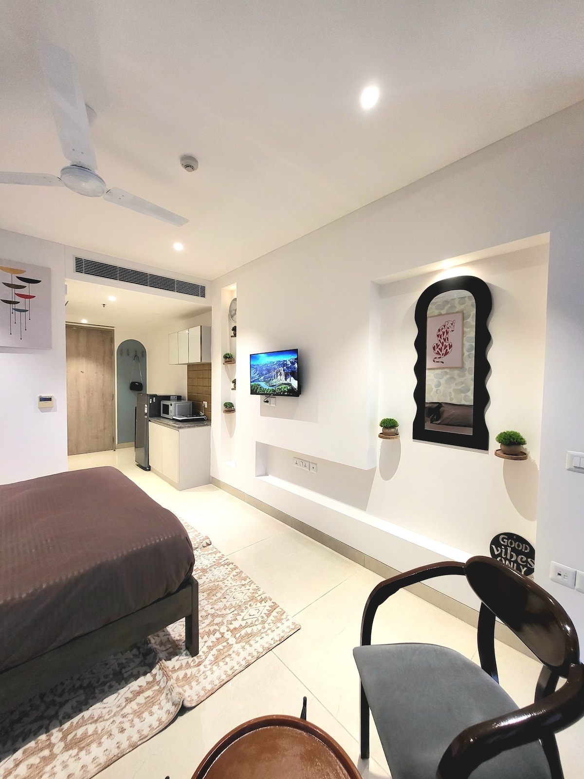 Discover unparalleled comfort in our Boho chic 1 BHK suite in Gurgaon. Enjoy a cozy living area, well-equipped kitchen, a lively bedroom, modern bathroom, and a balcony with stunning views. Stylish living space with books, board games, plants, and boho chic decor. Immerse yourself in luxury with full power backup and 24x7 security. Your comfort is our priority – experience a stay where every detail is crafted for your delight. Reserve now for a unique blend of sophistication and warmth!