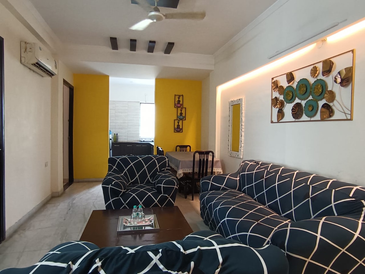BLUO STAYS - Award-winning Homes! Best Location - spacious Designer Apartment (625 sq ft) opposite famous DLF Galleria Market with Cross Point Mall & City Club on left side. It has King Bed, Bathroom with BathTub, Work Desk, separate Living Room with Couch & Dining Table, private patio seating & full Kitchen with gas stove Fridge, Microwave, cutlery-crockery, etc. All-inclusive Daily Rental- WiFi Internet, Netflix/TataSky, Cleaning, Washing Machine, Utilities, Parking, Power Backup, Gym, TT..
