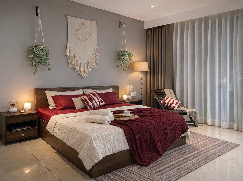 Discover unparalleled comfort in our Boho chic 1 BHK suite in Gurgaon. Enjoy a cozy living area, well-equipped kitchen, a lively bedroom, modern bathroom, and a balcony with stunning views. Stylish living space with books, board games, plants, and boho chic decor. Immerse yourself in luxury with full power backup and 24x7 security. Your comfort is our priority – experience a stay where every detail is crafted for your delight. Reserve now for a unique blend of sophistication and warmth!