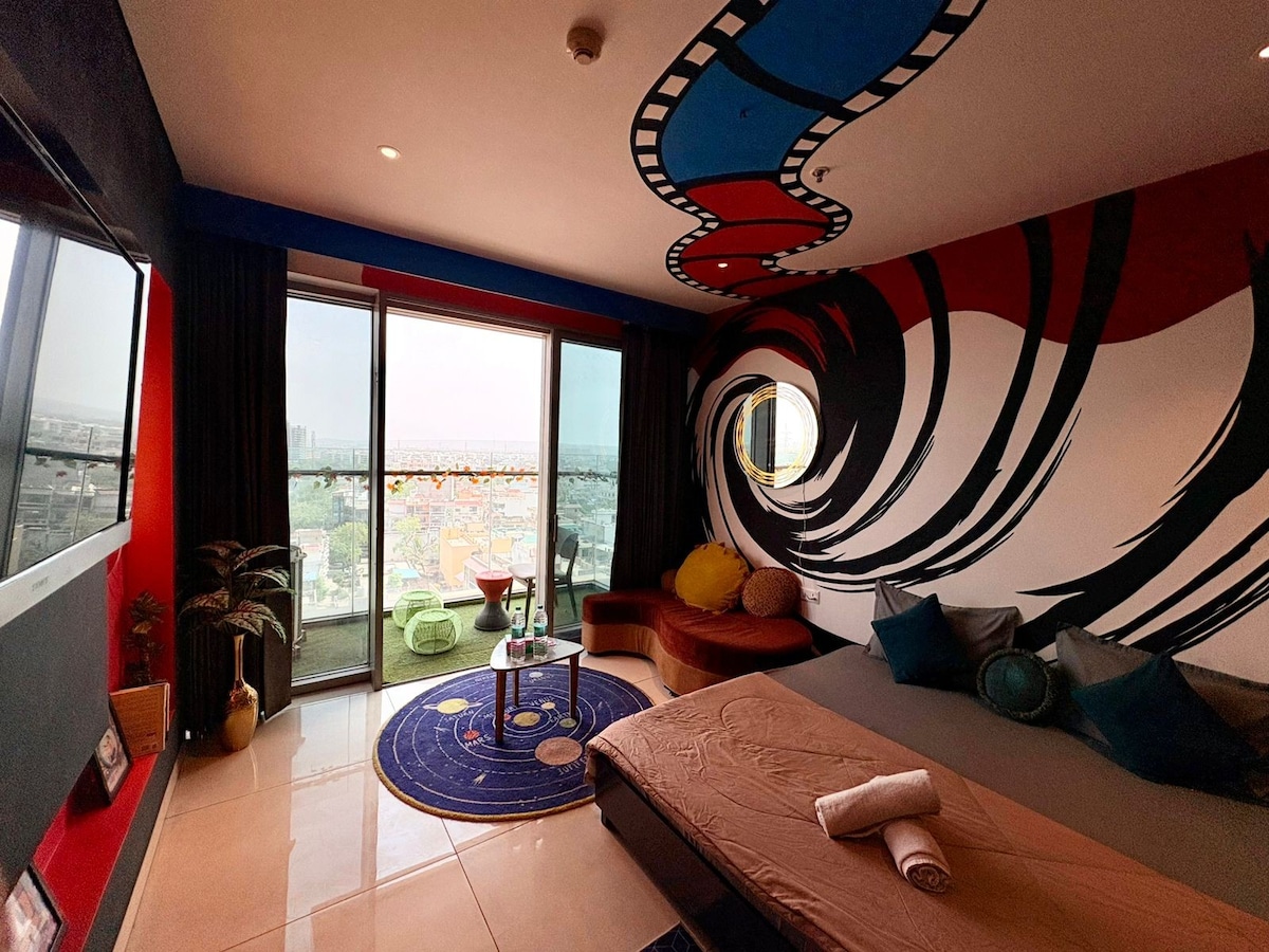 Luxe Heaven Heights 12th Patio 2 stands out with its private 2-seater jacuzzi, stunning high-rise city views, and modern architecture. The big wall mirror adds elegance, while the spa-like bathroom ensures luxury. Guests enjoy a pool, gym, high-speed WiFi, big-screen TV, and 24x7 security & parking. The fully equipped kitchen makes home-cooked meals easy. Located in Gurgaon’s prime area, it’s super safe for women and offers exclusive private access!