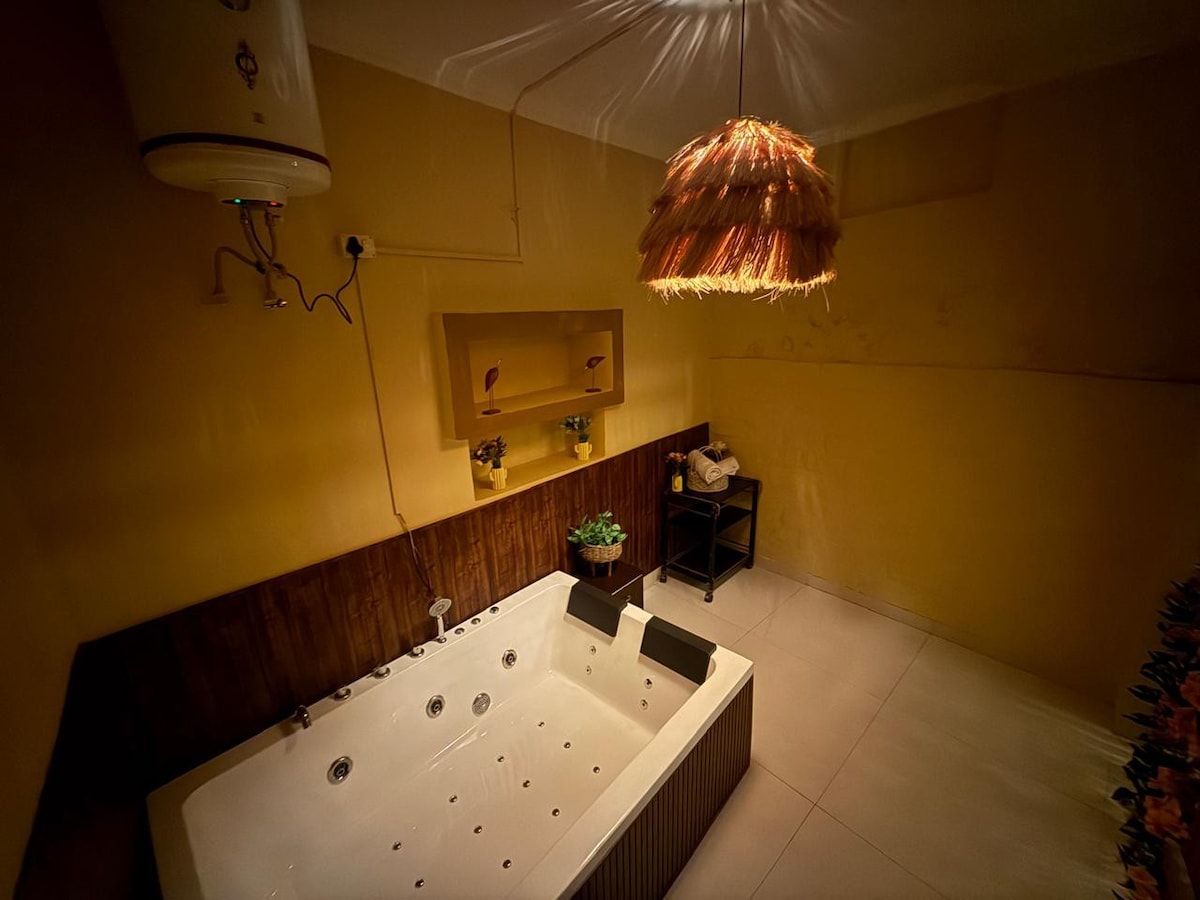 Insta - airbnb_gogo.homes Gogo Homes Kimika is the perfect retreat to recharge and relax. Enjoy a stay featuring a soothing nozzled live Jacuzzi, ideal for unwinding. After your soak, take in the stunning views of Gurgaon’s skyscrapers from our terrace garden, with delicious bites from nearby award winning restaurants Located in the upscale Sector 27 of Gurugram! Price mentioned is for 2pax. Although space is good enough to invite people for gatherings! Extra guests will be chargeableable.