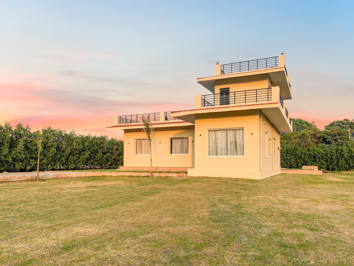 Nestled within a lush golf course, 1.5 hrs away from the heart of South Delhi, this Villa comes with 3 plush bedrooms, each with its own attached bathroom. The Villa has a fully equipped kitchen ensuring you have everything you need. Entertainment is never compromised with a smart TV at your disposal, along with high-speed WiFi. Venture downstairs to our cosy basement featuring an outdoor mural. And if indulgence beckons, you're just a stone's throw away from the ITC Grand Bharat Hotel.