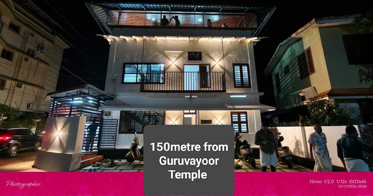 Located 900m from Guruvayoor Temple, the ground floor offers 3 spacious AC bedrooms with attached bathrooms, a cozy living room with sofa and TV, and a fully equipped kitchen with fridge, stove, microwave, and utensils. Perfect for families, it also includes a washing machine, high-speed Wi-Fi, inverter backup, hot water, and 24/7 CCTV. Enjoy a private and peaceful stay on the ground floor of a partitioned home close to Guruvayoor and Mammiyoor Temples.