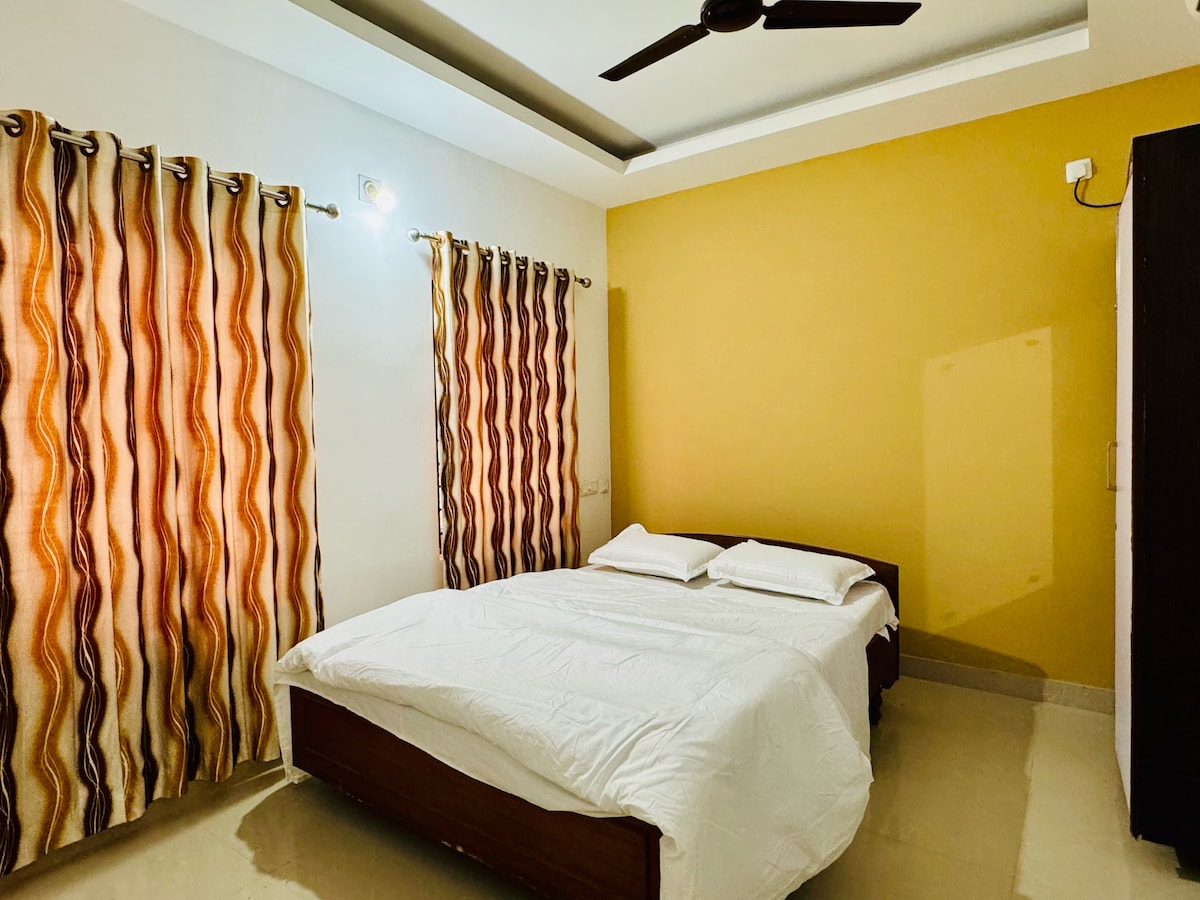 Experience the warmth of a home away from home in this fully furnished 1 bedroom AC apartment in a gated residential building with 24*7 security and private parking. Unwind in our thoughtfully designed space with premium bedding, AC & modern amenities. In addition to a queen bed, we have a floor mattress as well. Take a leisure 10-min walk to the temple or let us arrange a convenient ride for you! As local hosts, we are happy to share insider tips on exploring our charming town.