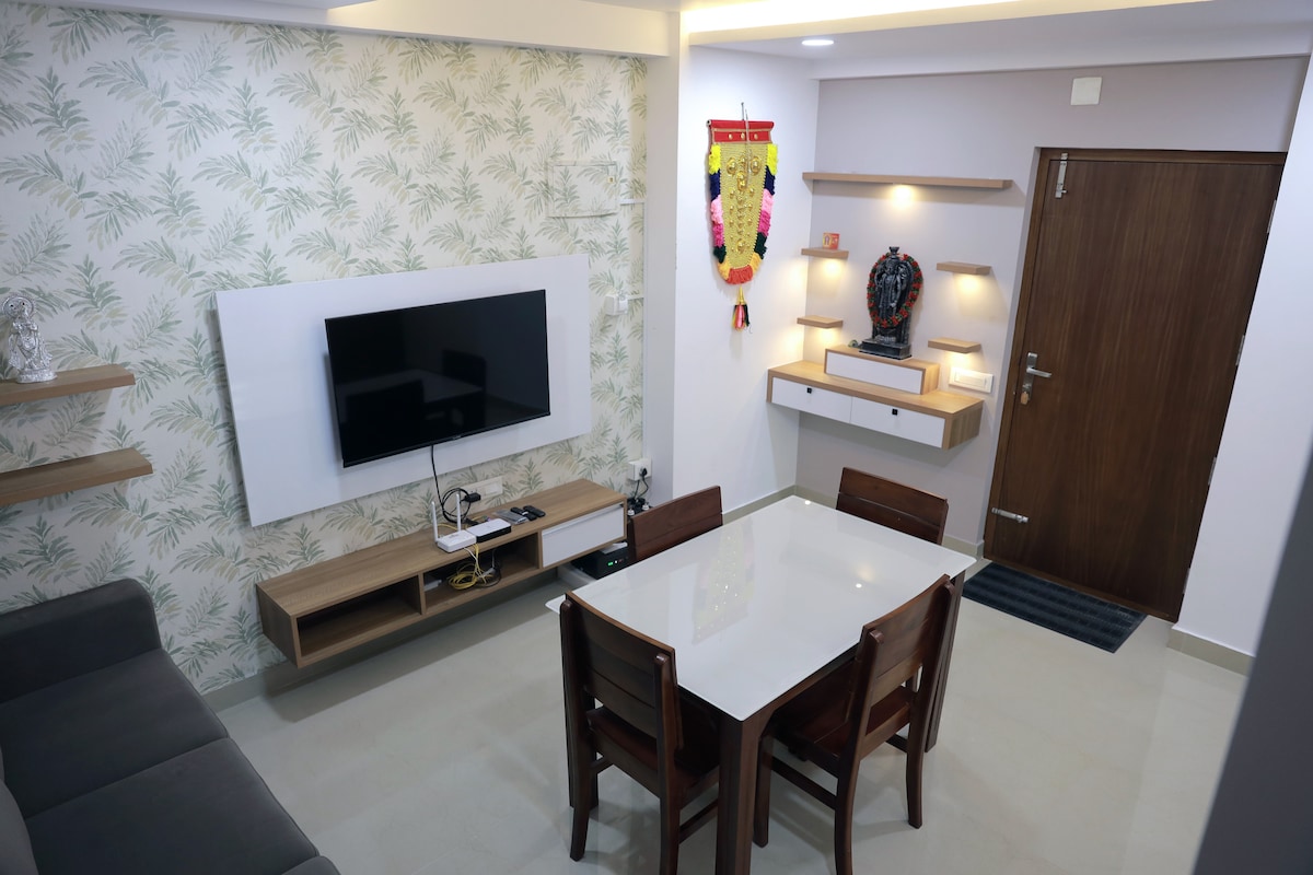 Premium 1BHK apartment with spacious, comfortable and elegant interiors, fully furnished 1 bedroom AC apartment in a gated residential building with 24x7 security with CCTV and private parking. Unwind in our thoughtfully designed space with premium bedding, AC & modern amenities. In addition to a queen bed, we also provide a premium dining area along with the kitchen. The balcony is spacious and calm with seatings. Guruvayur temple is just 500 meters walkable distance from our apartment.