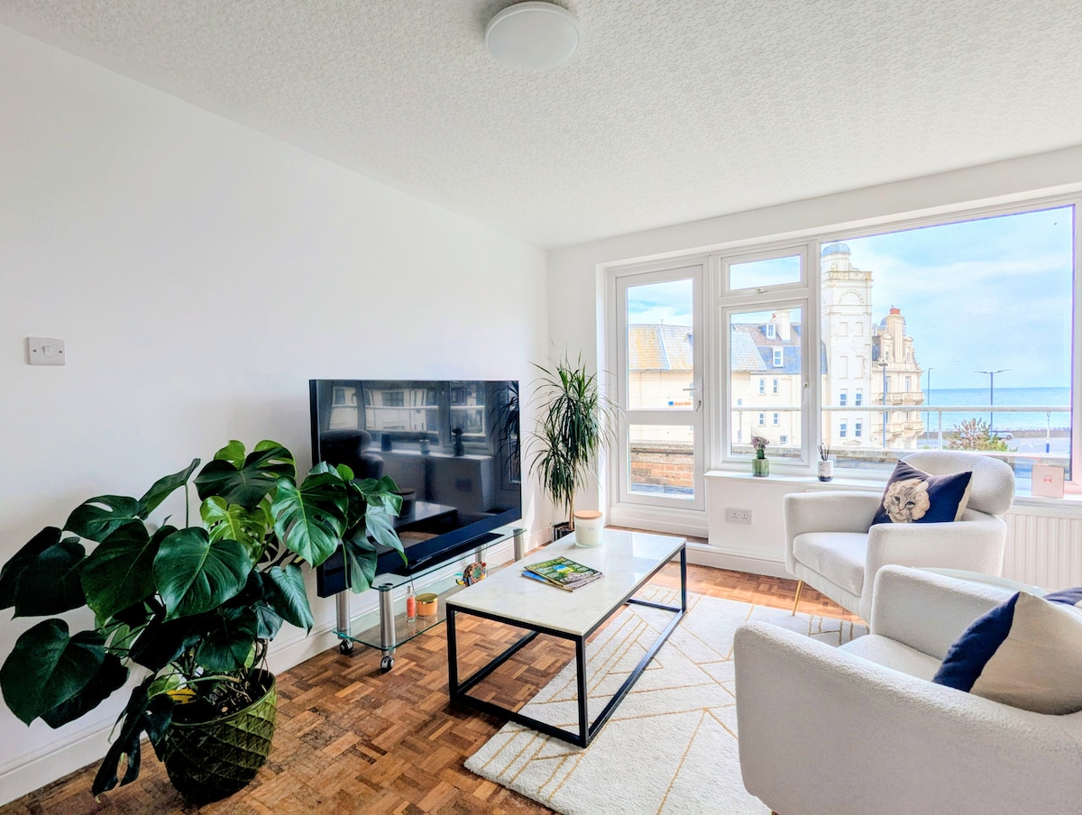 Gorgeous, spacious, south-facing flat with stunning sea views, original features, and high ceilings. The sunrises/sets and moon reflections are breathtaking! In between St Leonards on Sea and Hastings, and 30 seconds to the beach! The bedroom has a king size bed and the living room a double sofabed. Bedding is cotton/linen washed with non toxic products. Flat is on the 3rd floor but not that many stairs and as such, sea views far from the madding crowd! There is free parking nearby
