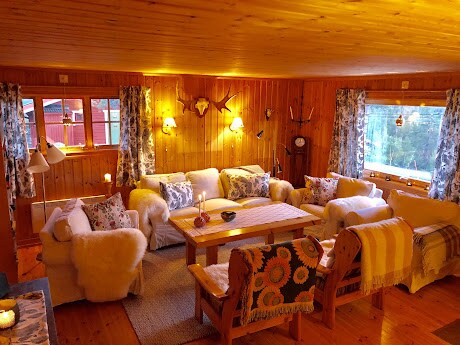 Het berghuisje ligt op een rustige, ruime locatie en is een ideale plek om volledig tot rust te komen en te genieten van de omringende natuur. Buiten vind je een groot terras met comfortabel meubilair en houtkachel, een grasveld, een sauna en een authentieke Scandinavische grillhut met open vuur en warme rendierhuiden. Een heerlijke plek om te ontspannen, te koken en te eten. Vanuit het huisje wandel je zo het bos in of naar schilderachtige zwem- en vismeertjes. Wintersport volop in de winter!