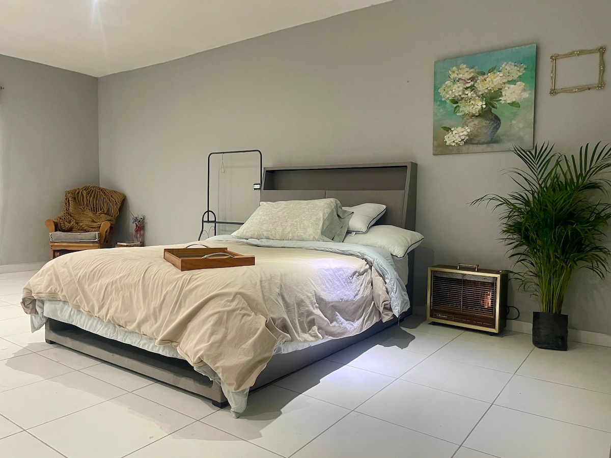 Relájate en esta casa completa ubicada frente al parque de una colonia tranquila. Ideal para dos personas. Cuenta con 1 habitación, 1 cama cómoda, 1.5 baños, sala, cocina equipada y área de trabajo, con aire acondicionado en toda la casa. Estacionamiento privado y techado, con área de asador. ¡Las mascotas son bienvenidas! Tiendas de conveniencia, farmacias y restaurantes se encuentran a menos de 5 minutos. ¡Te esperamos con un espacio limpio, cómodo y en una excelente ubicación!