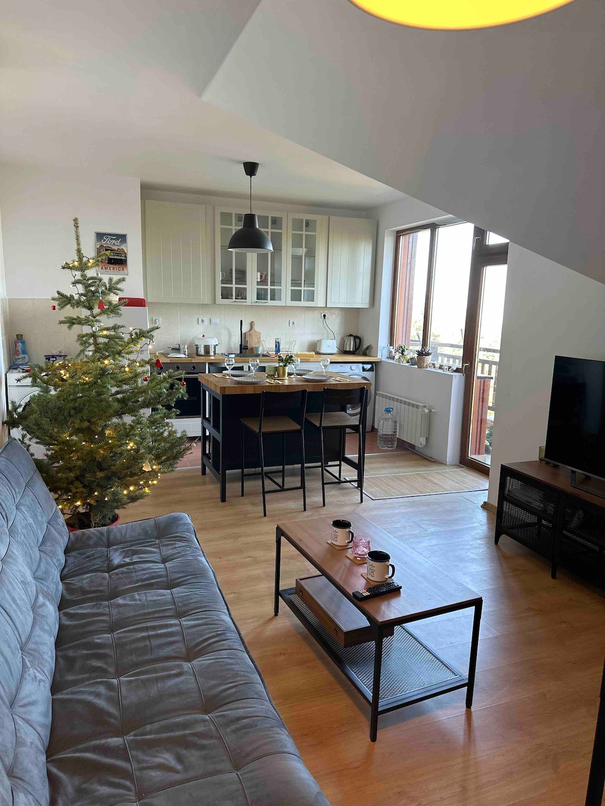 Spacious studio with fully equipped kitchen, a double comfortable bed and large sofa bed, wardrobe, commode and dinning table, comfortable chairs, TV and all you need for rest or home office in the mountain. The studio has its own large bathroom, as well as a seating area, and a terrace. Apt. B53 is located in the Borovets Gardens complex, a 7-minute walk from the gondola station. The building has a security and free guests parking.