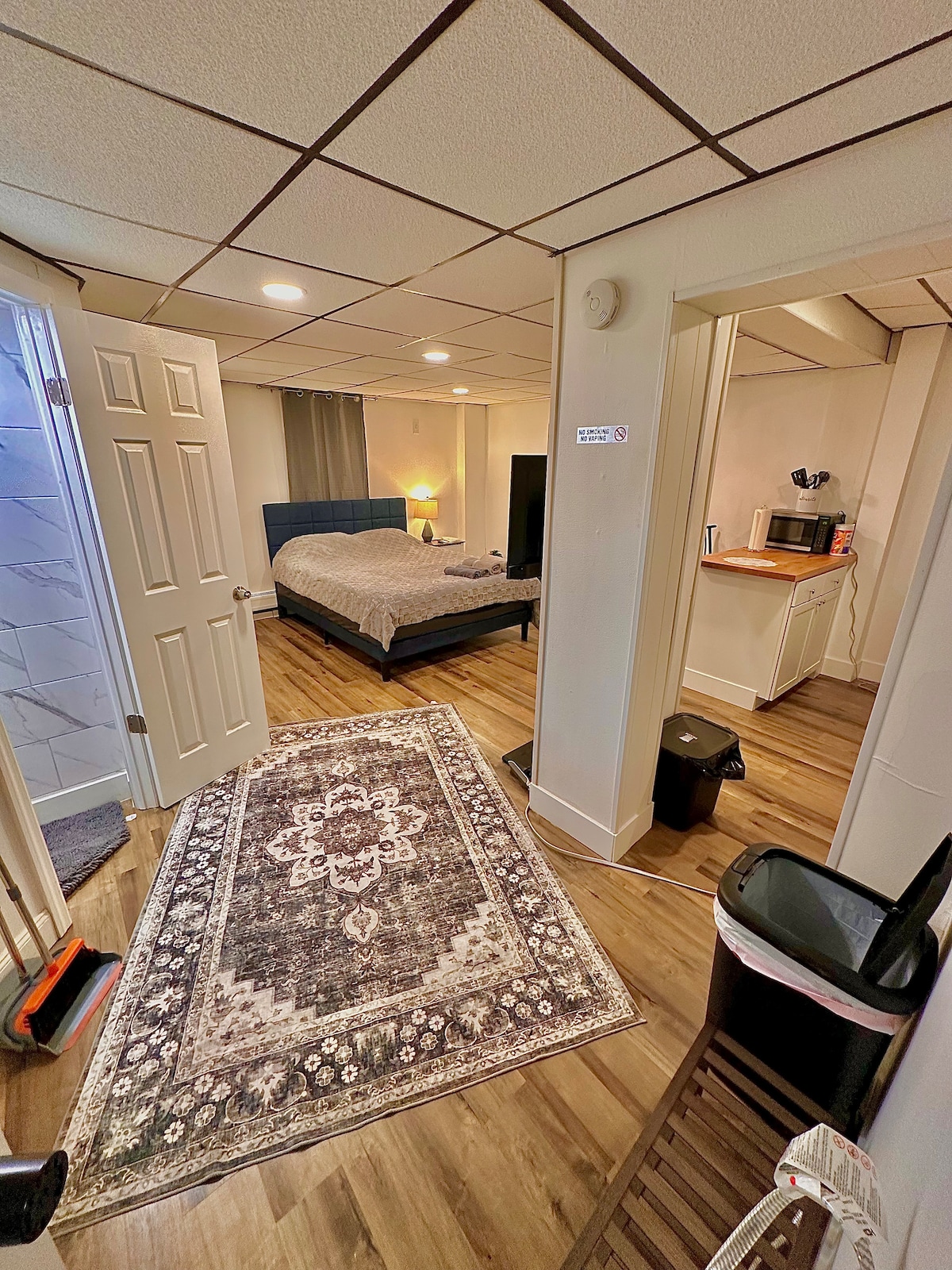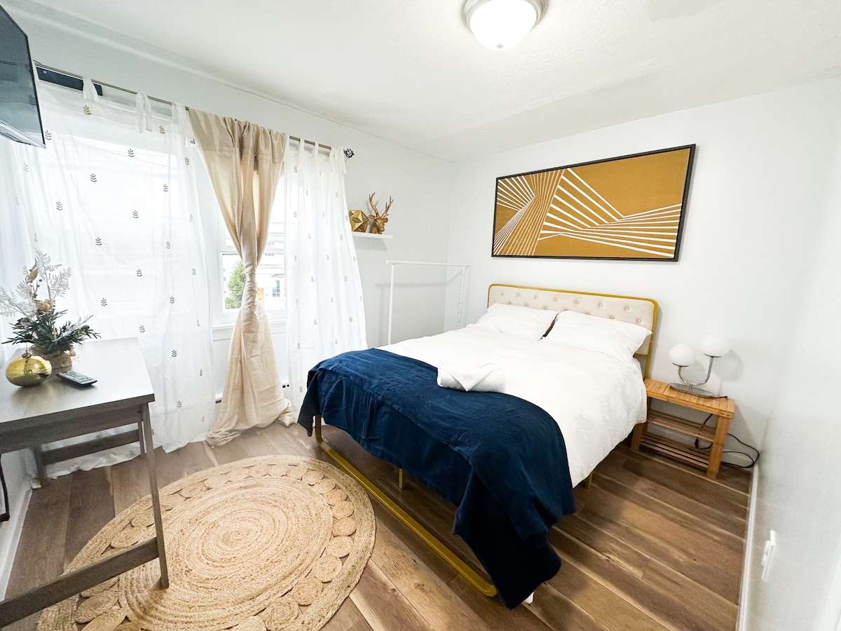 Charming 1-bedroom studio with a comfy queen bed 🛏️, small updated bathroom 🚿, and full kitchen 🍳. Smart lock entry 🔐 and charging ports by the bed 🔌. Fresh linens and towels included 🧺. Great space to unpack and relax. Note: Bathroom is tiny — not ideal if you need extra space. ‼️ No parking available — please don’t book if you have a car 🚗❌