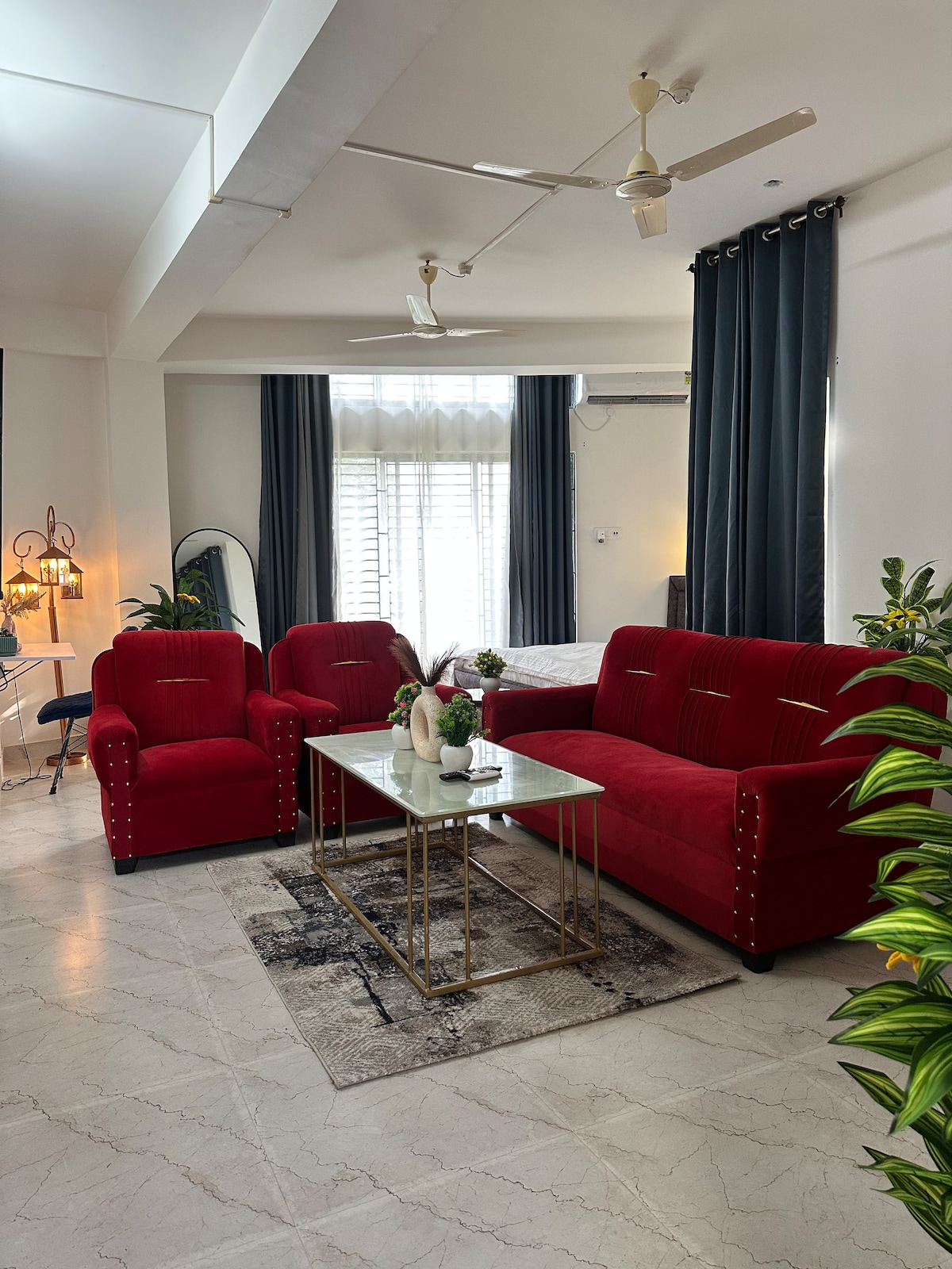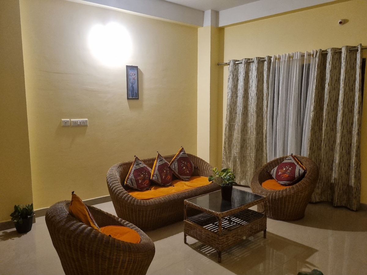 Bring the whole family to this great place with lots of room for fun. There are two bedrooms plus a full living room that has a single bed/diwan a comfy 3 seater couch and a dining table set. This is a full 2 BHK apartment comes with 2 bathrooms and a full kitchen.