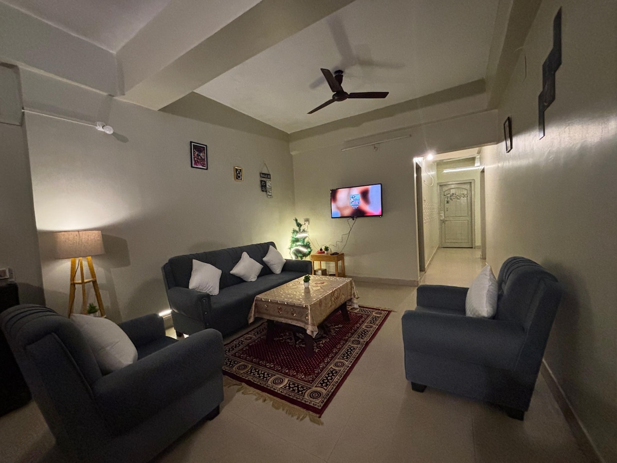 Relax with your whole family at this peaceful place to stay, organise family party and events. The property is a 1bhk apartment furnished with 1 bedroom with tv and king size bed, 1 hall with 1 bed, 1kitchen and 1 bathroom. All amenities are available for cooking and stay.