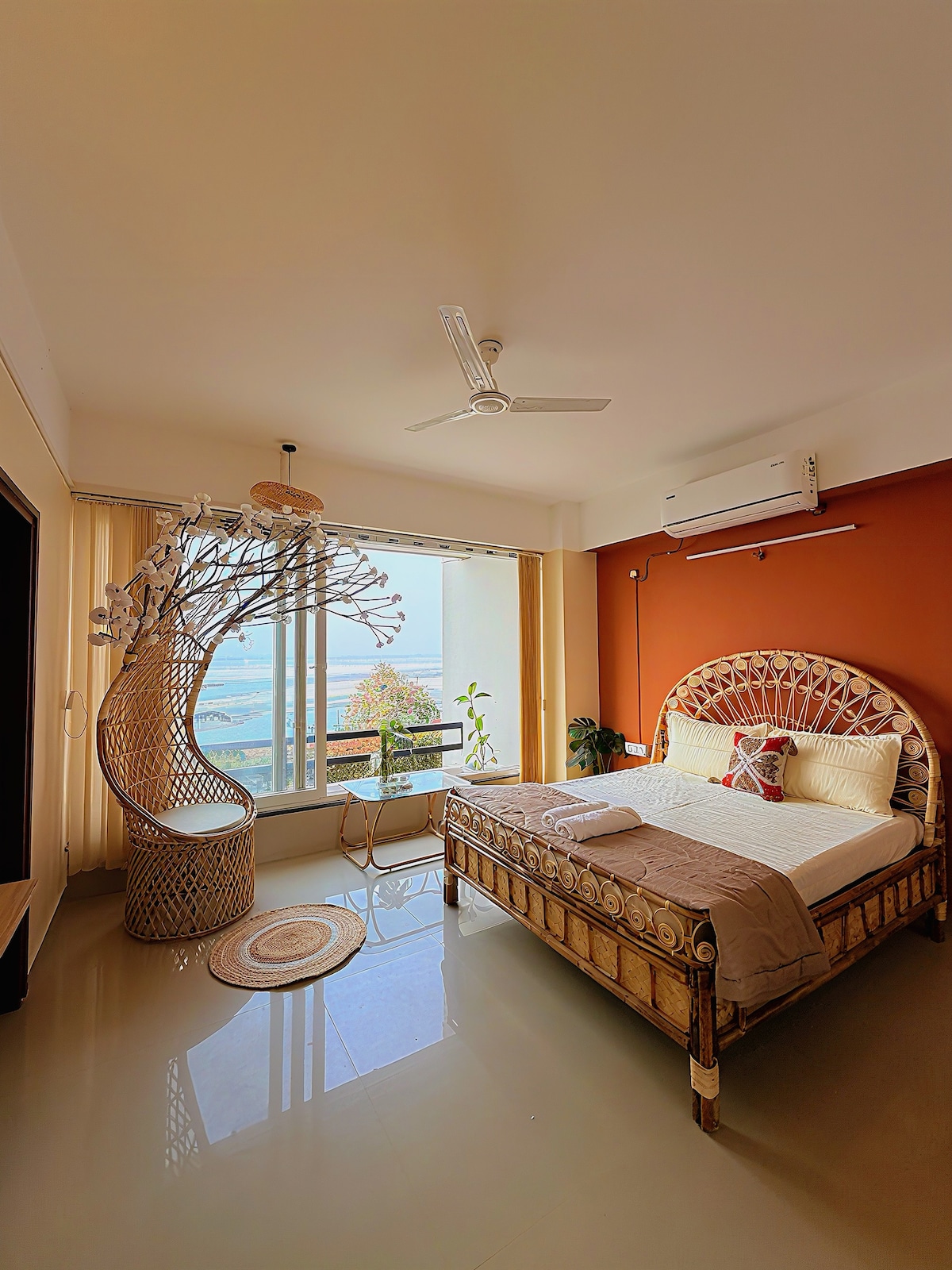 Spacious River View Suite with Private Balconies Located on the third floor, this suite offers two bedrooms, each with an attached balcony and stunning river views. The suite includes a living area with a 55-inch TV and a microwave. Both the bedrooms has 43-inch smart Tv's, AC, mini fridge, kettle with tea tray, and premium bed linen and mattresses. Perfect for a relaxing and luxurious stay.