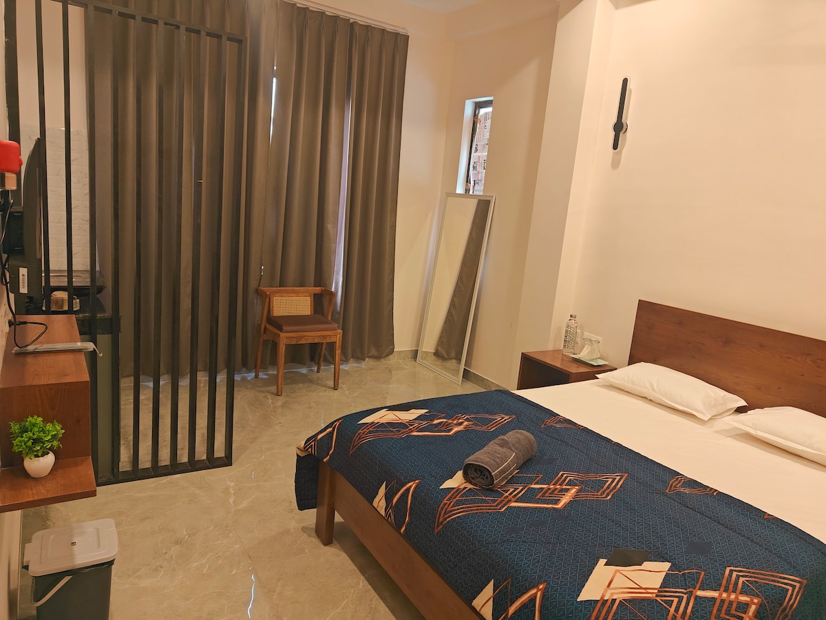 ✨ Cozy Studio with Private Balcony ✨ It’s a 8 feet by 10 feet set up A calm, cozy, and tiny studio perfect for couples seeking an intimate stay. It features a well-lit room with a queen bed, a compact kitchenette for light cooking, a modern washroom with a relaxing bathtub, and lift access for convenience. Step onto your private balcony to enjoy fresh air and peaceful coffee moments. This retreat blends comfort, privacy, and charm — ideal for both short getaways and longer stays.