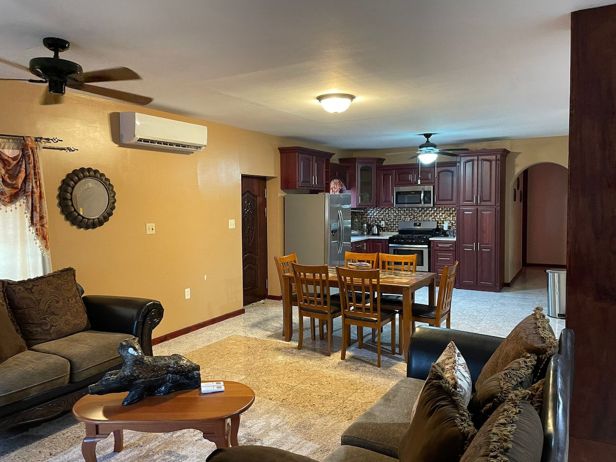 Lovely and Spacious 2 bedroom apartment designed for comfort and convenience. Centrally located in the heart of Skeldon, just minutes away from the Suriname ferry Stelling and the Springlands crossing, restaurants, bars, clubs, shopping area and public transportation. The apartment is family friendly, with all the amenities to make your stay feel like home away from home. Free parking is also available. This unit is fully furnished with 2 queens beds, living room area and a complete kitchen.