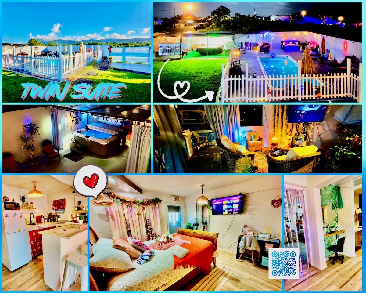 Private jacuzzi bathtub type inside the suite. We want to provide a pleasant and memorable experience. The facilities are spacious and modern. The shared suite has 1 bedroom with 1 queen bed and 1 inflatable queen in the living room and 1 queen sofa bed. For a total of 3 queen beds. Tell us what your visit is due to and we will make it special. Facilities jacuzzi, projector, pool, cistern and solar panels. 4 guests are included in the stay 2 additional guests for payment. Share the patio.