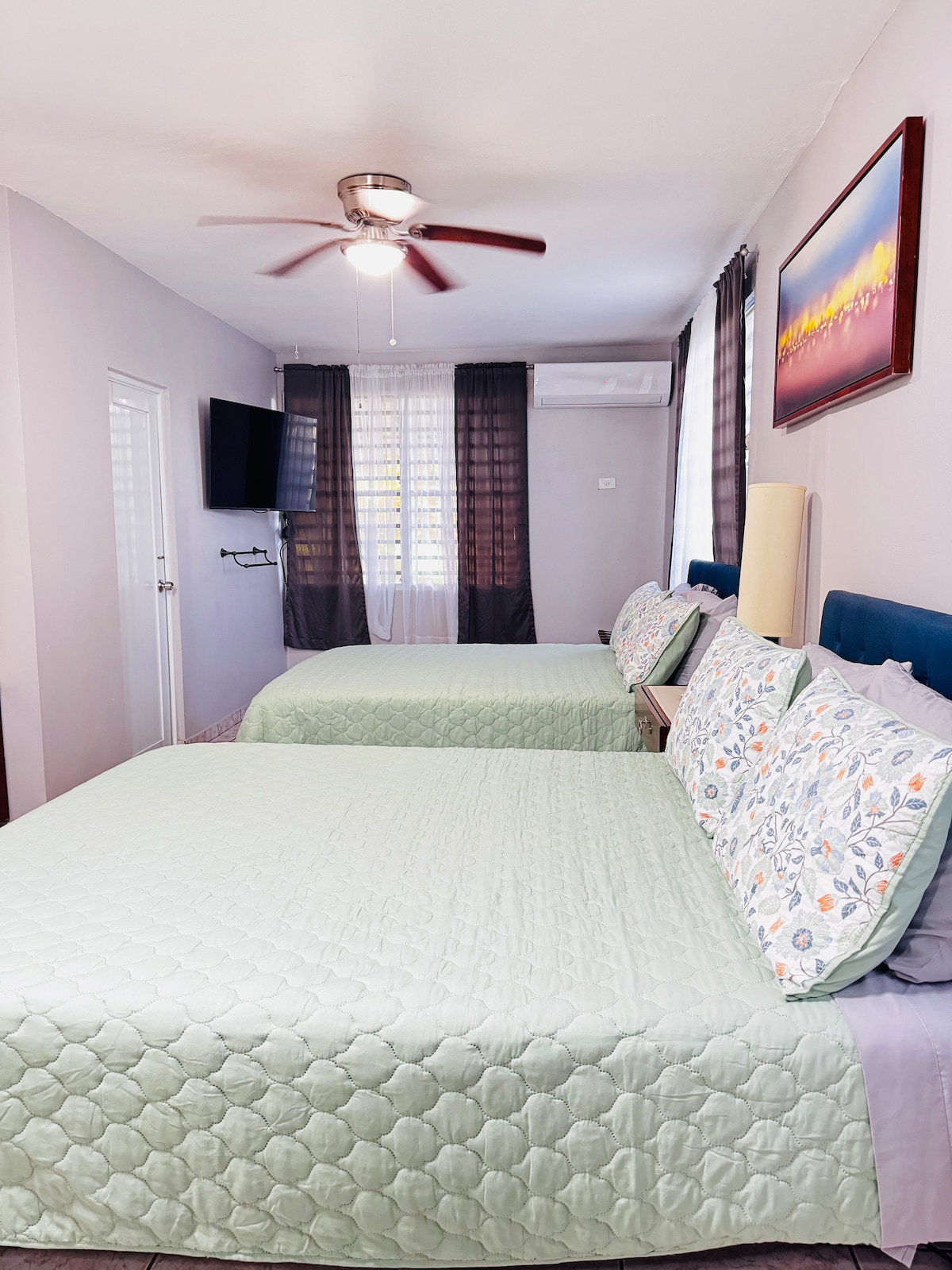 Ofrecemos a nuestros huéspedes un espacio con cocina y utensilios básicos, la cocina cuenta con microondas, tostadora, horno, cafetera y nevera. Sala cuenta con un mueble AC/C comedor. Ofrecemos una habitación que consta de una cama tamaño queen a/C T.V pequeño en la habitación, Wifi y Roku( con su propia cuenta) también pueden acceder a dos baños uno dentro de la casa y el otro esta ubicado en el área de la piscina. Hay una piscina 3@6 de profundidad. En la residencia hay agua caliente.