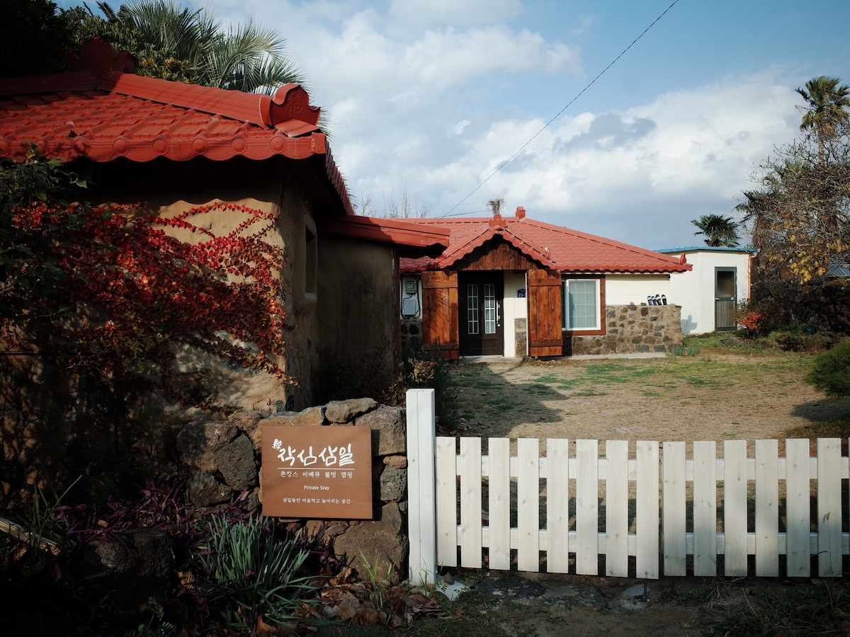 济州蒸汽石屋/免费按摩浴缸/充满LP感性/马歇尔扬声器/手冲咖啡/烧烤/2分钟到郭支海滩
