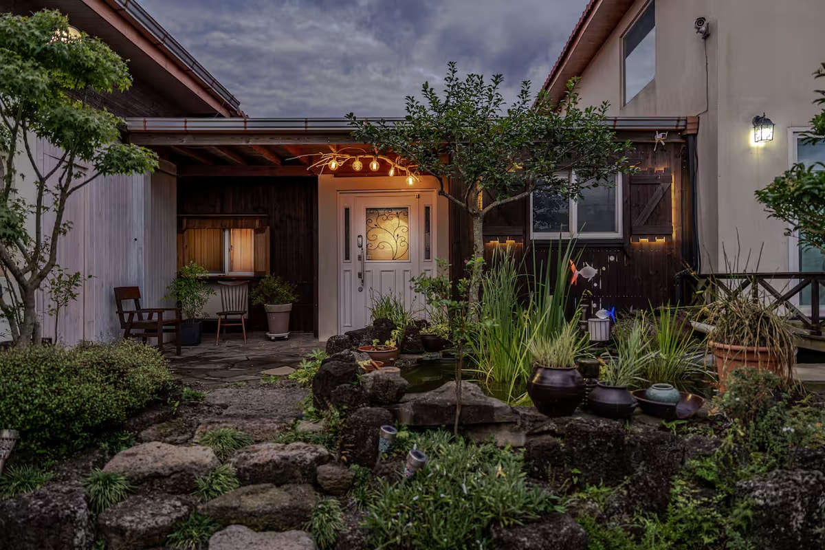 - Private, two stories wooden house, 2 Queen mattress bed rooms, 2 bathroom (one has a big bathtub) living room & kitchen. **If you're 2 people. you can use only 1st floor. ( 1 bed room, 1 bath room, living room & kitchen)** - Lovely flower garden & parking lot - Located in Aewol where it takes 30 min. from the airport. Close to beach, takes 7 min. - Maximum number is 5 including kid & infant.