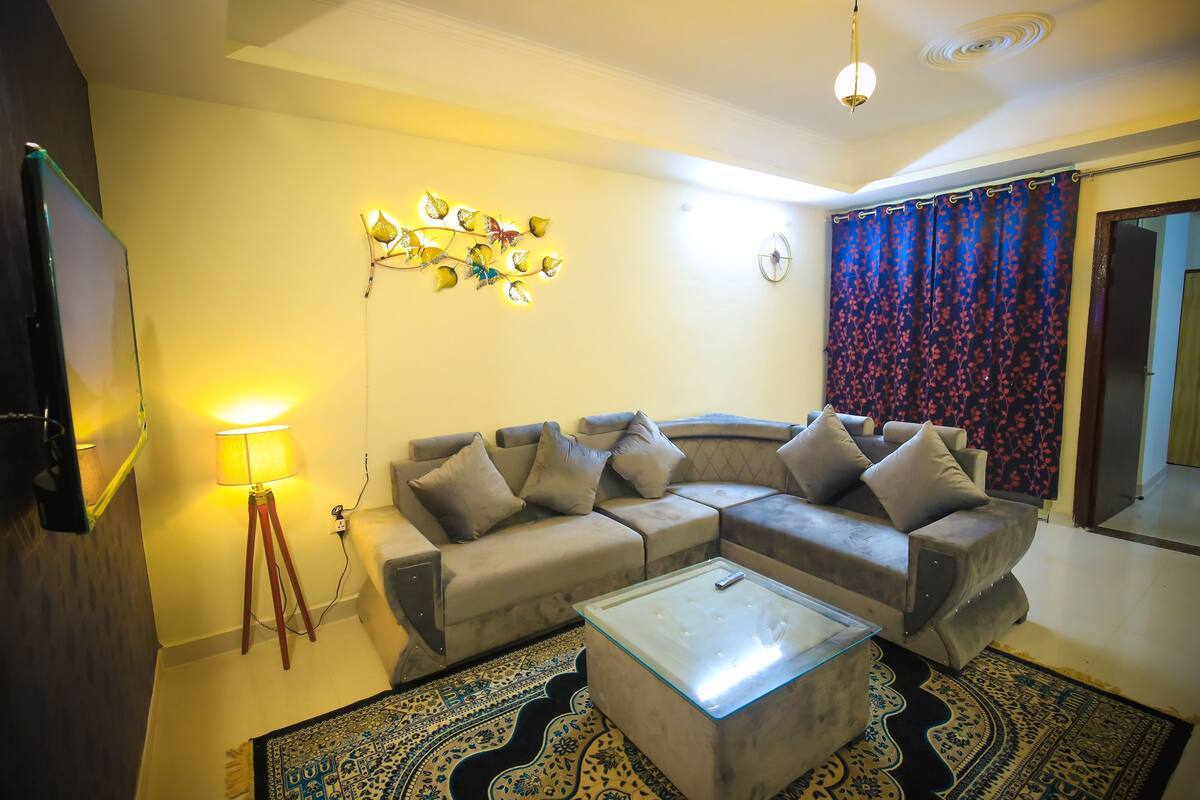 2 BHK fully furnished spacious apartment located on the 1st floor with ambiant lighting and peaceful surrounding, ideal for family and friends. The apartment includes all basic amenities like washing machine, microwave, geaser, 50 inch Smart TV etc. Please note, local IDs are not allowed. For non Indian resident travellers please confirm on message with me before proceeding with the booking.