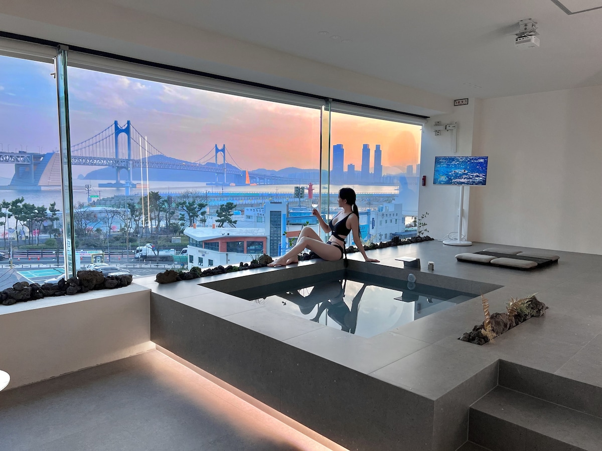 青学冬白。室外按摩浴缸、免费停车、釜山港大桥正面全景、疗愈独享、景观美食、感性膳宿公寓。保留净水器