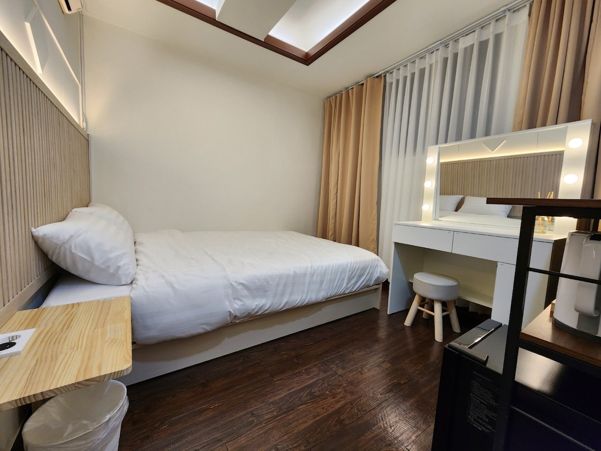 [NEW OPEN] ● STAY SAI 스테이사이 [1인실] -. 최대인원 : 1명 -. 혼자 머물기에 깔끔하고 아늑한 공간이에요. (개별 화장실 있음) -. 엘레베이터가 없으며 1인실룸은 1~2층에 랜덤 배정됩니다:) -. 핫한 광장시장 바로 앞, 지하철 종로5가역에서 도보 3분거리에 위치해요. -. 광장시장에서 맛있는 음식을 포장해와서 예쁜 공용부 공간에서 드실수 있어요. -. 숙소 이용객에게는 6가지 종류의 한국라면을 무료로 제공해요:) -. 간단한 조리가 가능한 예쁜 공용주방이 마련되어있어요:) -. 구비 가전 : 세탁기 / 건조기 / 냉장고 / 전자레인지/ 토스터기 / 조리도구 / 주방도구 / 각방의 에어컨난방시설 ● 호텔 베딩을 사용, 매번 살균 세탁된 깨끗한 침구를 제공해요. ● 매월 전문업체를 통한 정기 방역을 하는 안심 숙소에요:) ● 호스트가 직접 청소 관리를 하는 청결한 공간이에요.