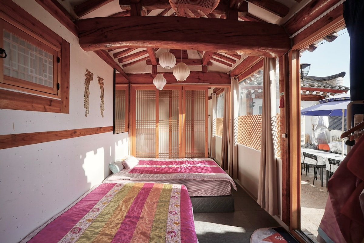 🏯 Chalet de Anguk – Hanok Stay in Cultural Heritage Site of Seoul Once the royal study site of Empress Myeongseong, this private villa is designated as Cultural Heritage of Seoul No. 30. This Hanok features two bedrooms, two bathrooms, a grand daecheongmaru (wooden hall), and a stylish kitchen. Hidden beyond the courtyard lies a secret tropical bath atrium, perfect for a luxurious bath. Equipped with Dyson Supersonic and Airwrap, it offers complete privacy, and comfort in the heart of Seoul.