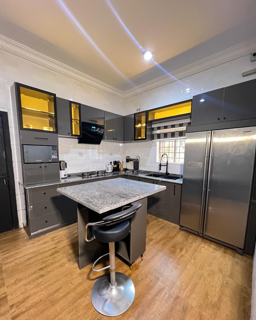 Pinewood suite , a contemporary 2 bedroom Apartment intentionally furnished with you in mind. The woodwork is unique and detailed to give our guests an unforgettable experience in a clean environment. It is furnished with smart Tv, smart door, fast and efficient wifi, Swimming pool, table tennis, snooker table, standby generator, solar powered inverter air conditioning units, water heaters and a fully equipped open plan kitchen concept. Have fun with the whole family at this stylish place.