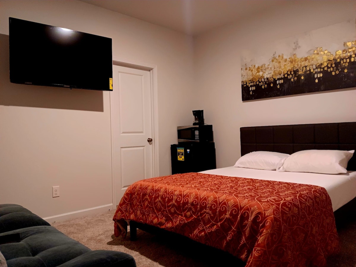 - Private space with its own garage entrance for a peaceful stay. - Fully equipped kitchenette with a sink, electric stove, wood countertops, cabinets, and all essentials. - Easy walk to Suwanee Town Center (1 mile) and quick access to I-85. - Comfortable living area with a bathroom, mini fridge, and microwave. - Fast WiFi, smart TV, and a cozy electric fireplace. - Book now for a convenient and private retreat in Suwanee.