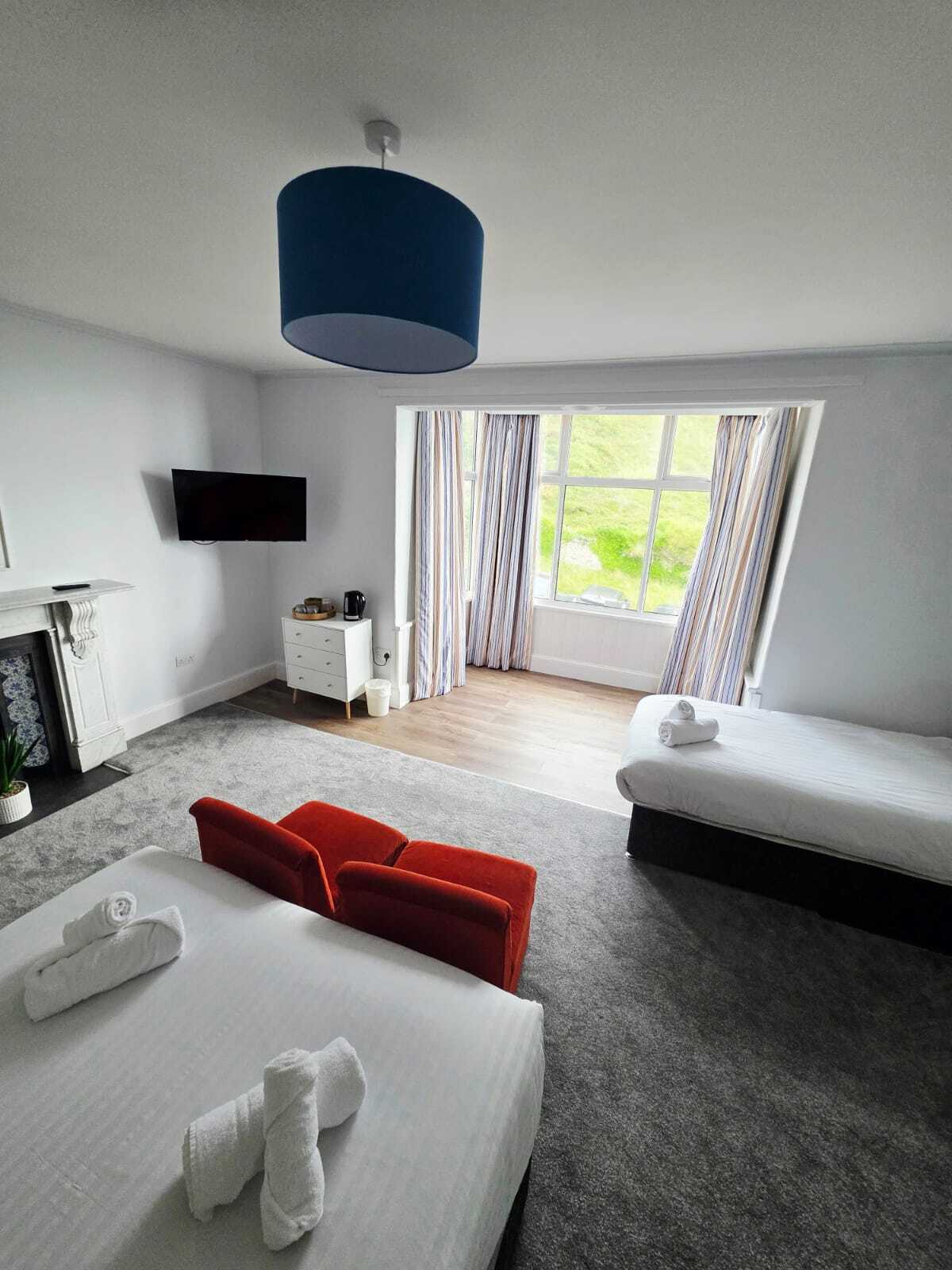The Merion Suite at the Merionnydd Hotel offers elegance and comfort on the 3rd floor with stunning views over Dolgellau’s town square. Inside, you’ll find a king-size bed, a cosy seating area, and a coffee machine for a perfect start to your day. The modern en-suite includes a spacious walk-in shower for added luxury. With its central location, the Merionnydd Hotel makes the Merion Suite an ideal retreat for both relaxation and adventure.