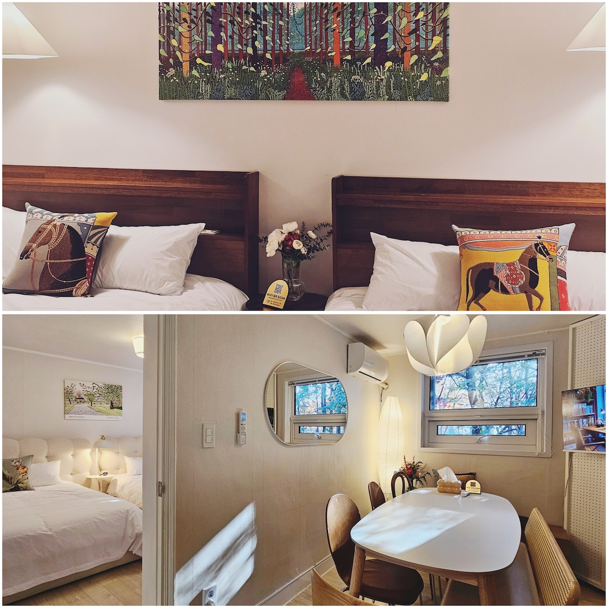 💜 신축건물 조용한 주택 2층 입니다. 💜 깨끗하고 사랑스런 컨셉의 퀄리티있는 숙소를 거품없는 가격으로 제공하고 있습니다. 💜 23평 넓고 쾌적한 공간. 호텔식 침대 및 침구. 6인 대형 테이블이 마련된 독립 다이닝룸. 50인치 스마트 TV (유튜브, 넷플릭스, 티빙 개인계정 시청가능) 💜 예약인원 외 추가인원 입실 불가. 적발시 환불 없이 즉시 퇴실 조치 (방문인원 입실불가 ) ※ 공동현관 CCTV로 체크합니다. 💥1~2인 예약시 : 침실1 또는 침실2 중 선택 (기본 침실1 제공) 제공외 침실 CLOSED 침실1, 2 모두 사용시 1박당 3만원 추가요금 발생 💥 3인 예약시 : 침실1 + 침실2 (슈퍼싱글 침대) 💥 4인 예약시 : 침실1 + 침실2 (슈퍼싱글+싱글침대) 🍒 5인 예약시 : 모든 침실 + 토퍼 💜 변기에 물티슈 사용 불가 입니다. 변기가 막힐 경우 수리비 50만원 청구 됩니다.