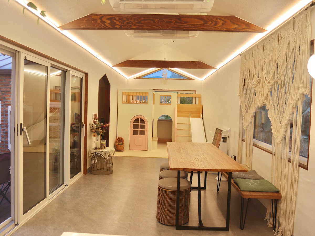 + 庆州独栋 苏汉屋 与亲爱的家人一起享受烧烤、迷你泳池、壁炉、阿公屋韩式暖炉、戲戲跳、掷柶游戏~