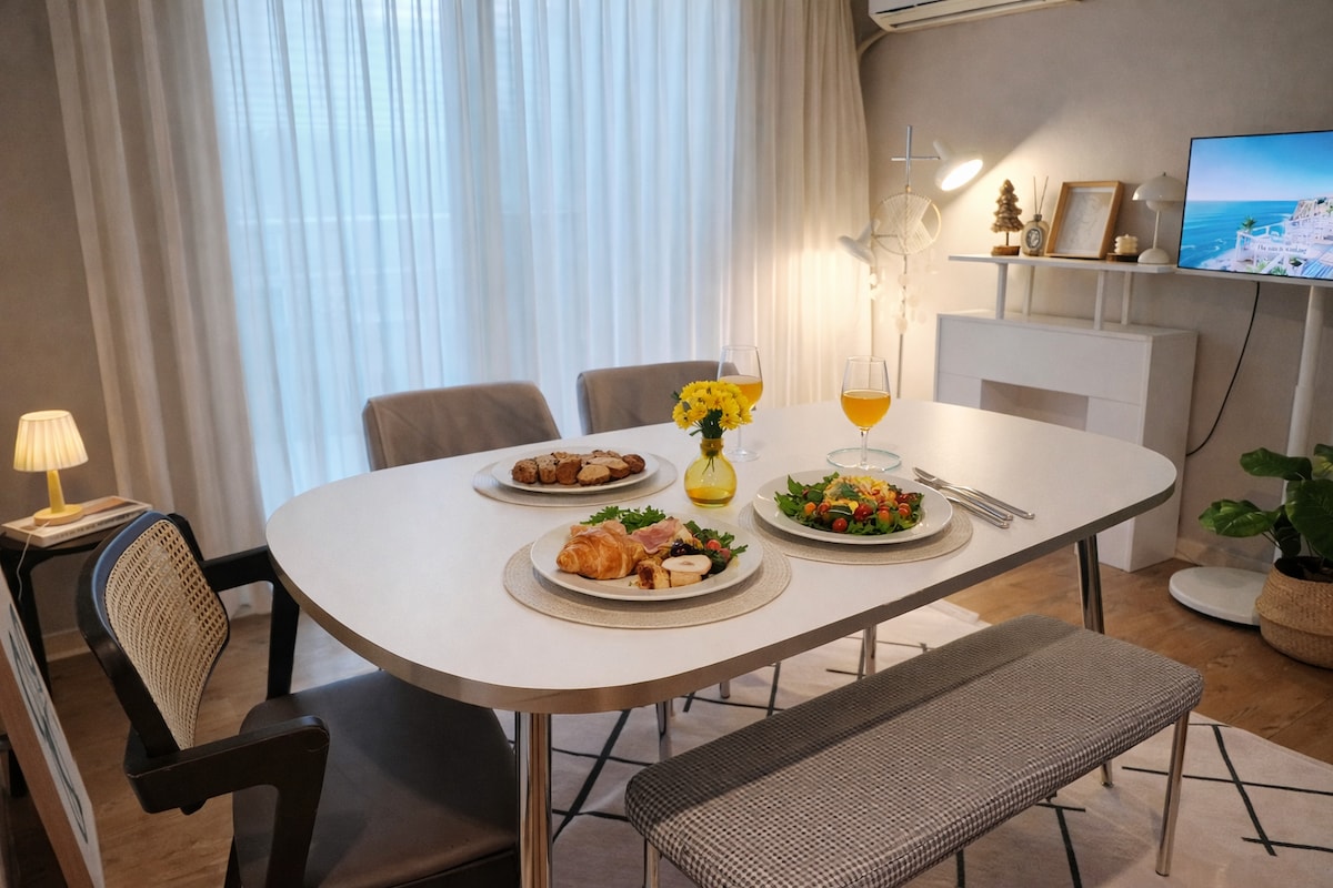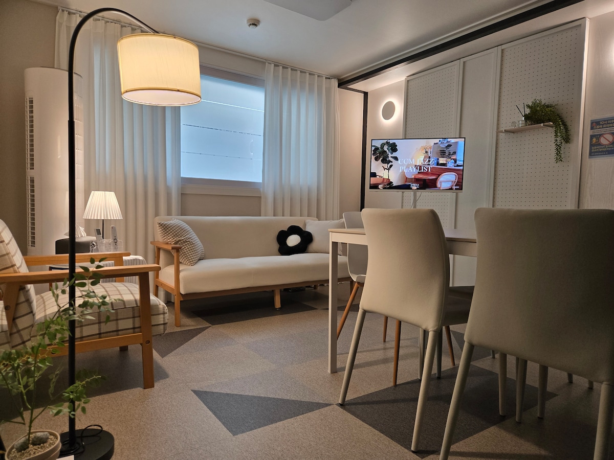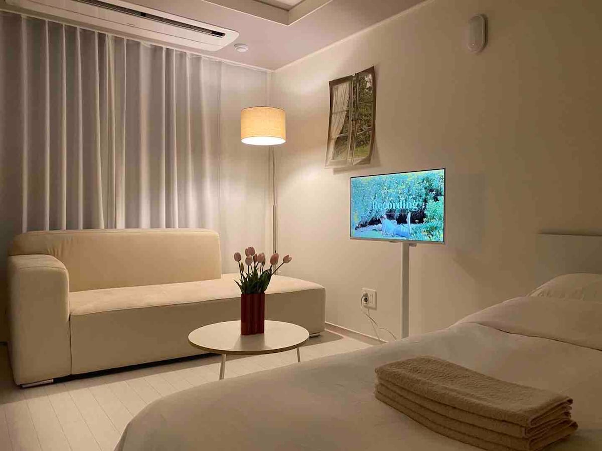 🍀숙소설명을 필독 해주세요🍀 호스트가 직접 관리하는 숙소입니다🩵 매일 방역 및 청결하게 유지하고 있습니다. ✔️체크인 4pm ✔️체크아웃 11am (리뷰이벤트 참여시 호스트와 상의) 📌숙소 옵션 -삼성 스마트 TV -삼성 시스템 에어컨 -초고속 wifi 지원 -삼성 스타일러 -드럼 세탁기 -전자레인지 📌주방 옵션 -인덕션 2구, 전자레인지 -머그잔/와인잔 -s접시/m접시 -냄비1개 -조리도구(집게,국자,가위,칼) -수저셋트 📌저희 숙소는 간단한 조리(라면)만 가능합니다‼️ 참고해주세요!!😉🙏 ❌삼겹살,스테이크, 국, 찌개류, 파스타❌ 📌화장실 옵션 -핸드위시 -폼클랜징,클랜징오일 -샴프/컨디셔너/바디워시 -바디로션 -화장솜/면봉 -헤어드라이기 고데기