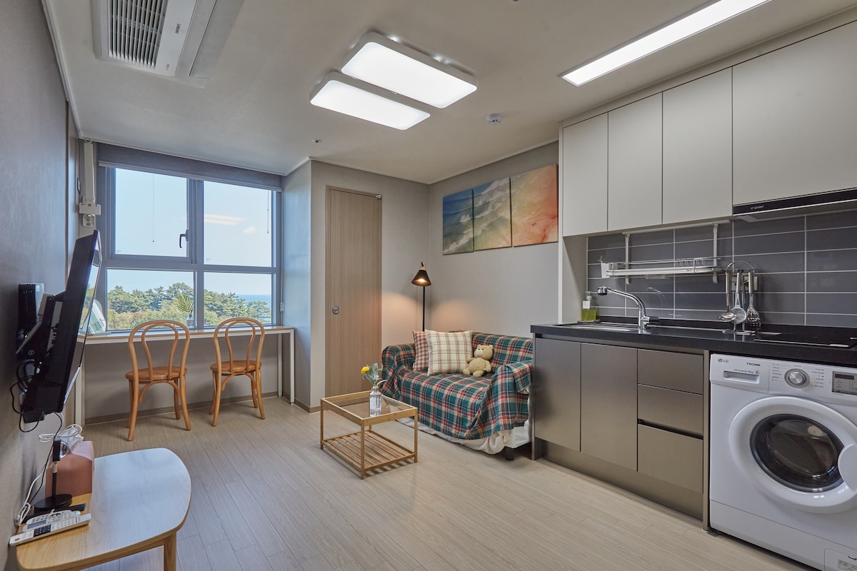 안녕하세요 "안녕,한섬"입니다. 안녕,한섬은 동해바다로 연인, 가족과 함께 여행오시는 분들이 편안하면서 즐겁게 머물다 가실 수 있는 공간입니다. 한섬해수욕장이 도보 5분거리에 있고 거실 테이블에 앉아 오션뷰를 즐길 수 있고, 침실에 설치된 빔프로젝트와 100inch 스크린으로 넷플릭스를 보며 숙소에서도 즐거운 시간을 보낼 수 있는 특별한 공간입니다. ➰ 침실1개, 거실, 주방, 화장실1개로 구성된 오션뷰 숙소입니다. ➰ 침실 퀸침대, 거실 쇼파베드로 최대4인까지 이용가능합니다. ➰ 침실 내 빔프로젝트와 100inch 스크린으로 넷플릭스 시청가능합니다. ➰ 무풍에어컨 거실과 침실 각 1대 설치되어있습니다. ➰ 주방 내 빌트인 냉장고, 전기쿡탑, 전자레인지, 압력밥솥, 커피포트가 있어 조리가 가능합니다. ➰ 드럼세탁기가 빌트인되어 세탁도 가능합니다. ➰ 바디샤워, 샴푸, 린스, 폼클렌징, 치약이 비치되어 있습니다.(칫솔,샤워타월은 제공되지 않습니다.) ➰ 반려동물 동반불가입니다.