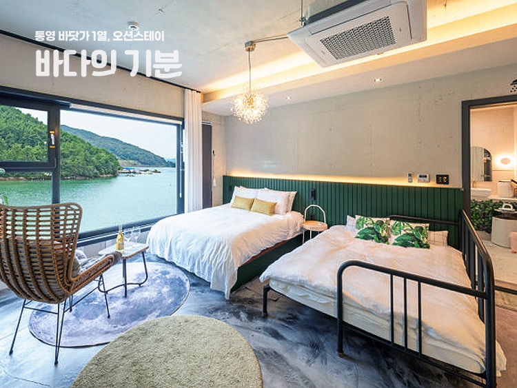 통영 바닷가 1열, 바다의기분 오션 스테이에서는 하루 2번 밀물때의 가득찬 바다와 썰물때의 갯벌이 드러난 사막같은 바다를 만날 수 있습니다. 시시각가 바뀌는 바다와 산이 통창가득 그린테라피되는 감성공간입니다. 바다의기분 1집은 조용하고 편안한 휴식을 위한 모던 오션뷰 스위트입니다. 2개의 킹사이즈 침대와 건식 사우나, 통창 오션뷰 라운지, 조식 룸서비스가 준비되어 있습니다. 그냥 쉴수 있는 공간, 집처럼 따뜻한 감성의 공간에서몸과 마음이 회복되는 진짜 쉼을 경험하세요. Small luxury, deep calm — where your moment becomes timeless.