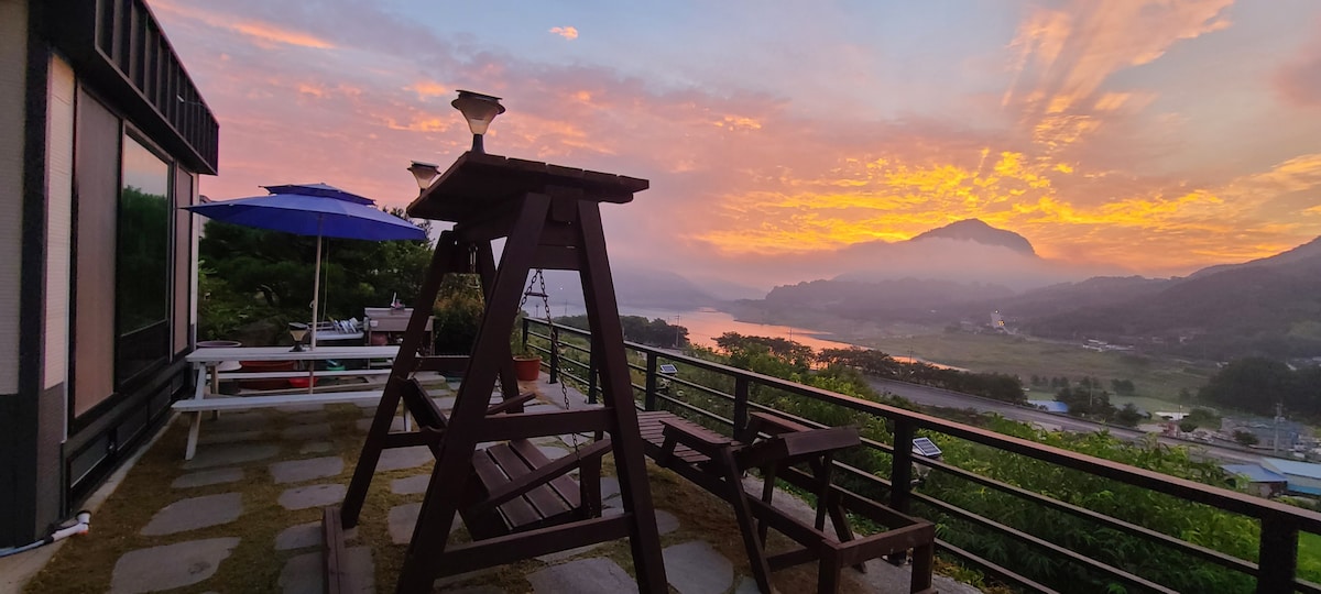 바닷가 바로접한 곳이라 커튼을 열면 그림같은 독일식 목조주택 입니다 복층구조에 사용 가능하며 대가족이나 각종 단체 숙박시 가라오케 까지 음향이 뛰어난 뮤지션용 음향기기 입니다 앞으로는 바다뷰 뒤로는 산이 환상적 입니다