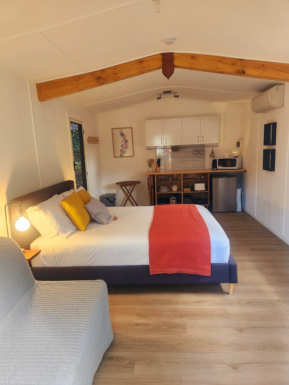 'Lane's End' is a luxury, self-contained, eco cabin located in the charming township of Eumundi, home of the famous Eumundi Markets. From it’s beautiful rural setting, walk just 17 minutes into the centre of town or take a short drive to Noosa and it’s stunning beaches. The cabin sits 60m from the regional train line, but don't let this deter you. The trains will peak your interest as they roll by, and the beautiful leafy-green outlook will allow you to immerse yourself in peaceful relaxation.