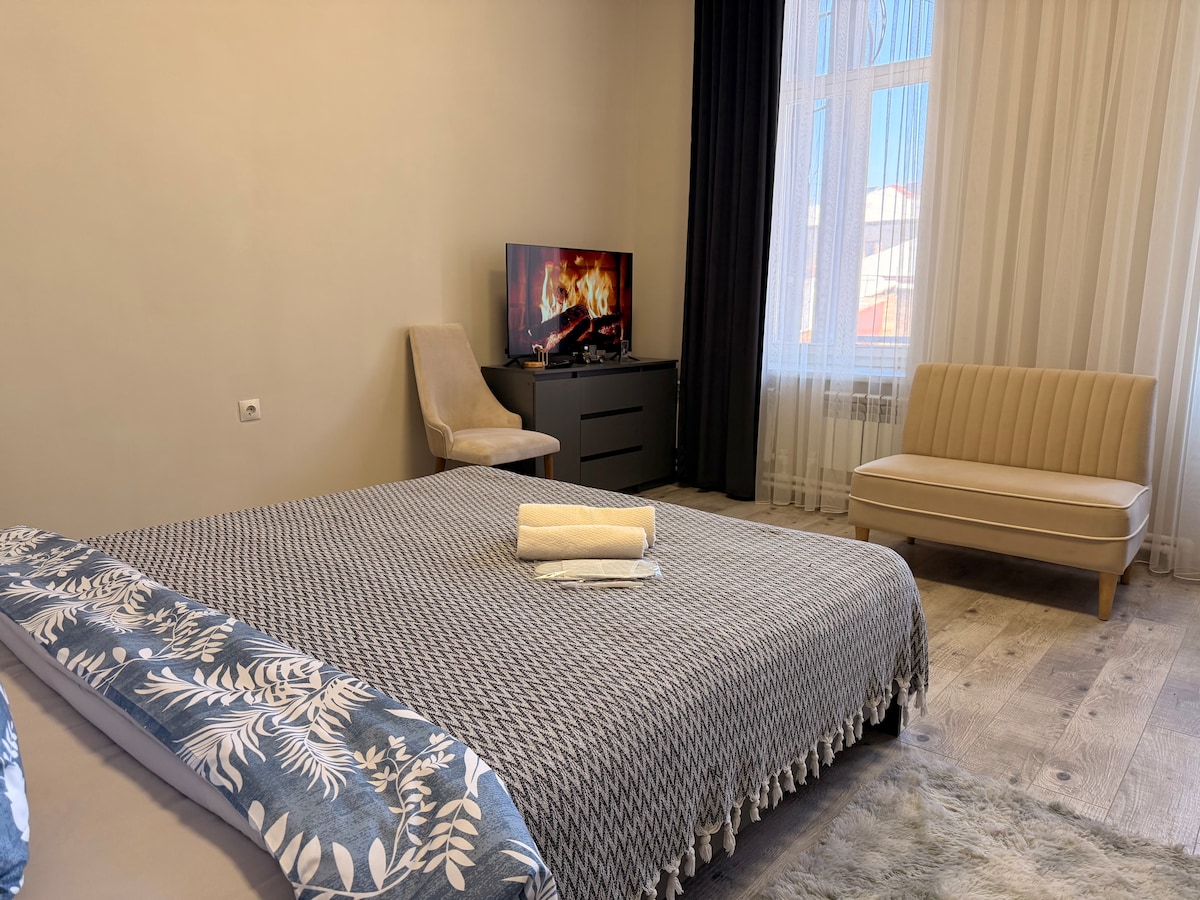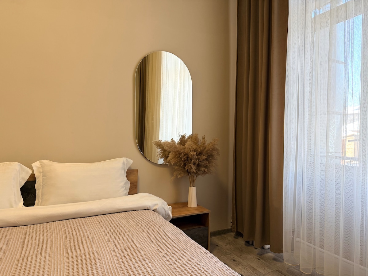 Cozy and modern room in the center of Gyumri. Quiet and convenient location close to cafes, restaurants, and main attractions. The room features a comfortable bed, fresh linens, Wi-Fi, heating/air conditioning, and power outlets near the bed. Guests have access to a shared kitchen, showers, a lounge area, and a balcony. Perfect for a comfortable short stay.