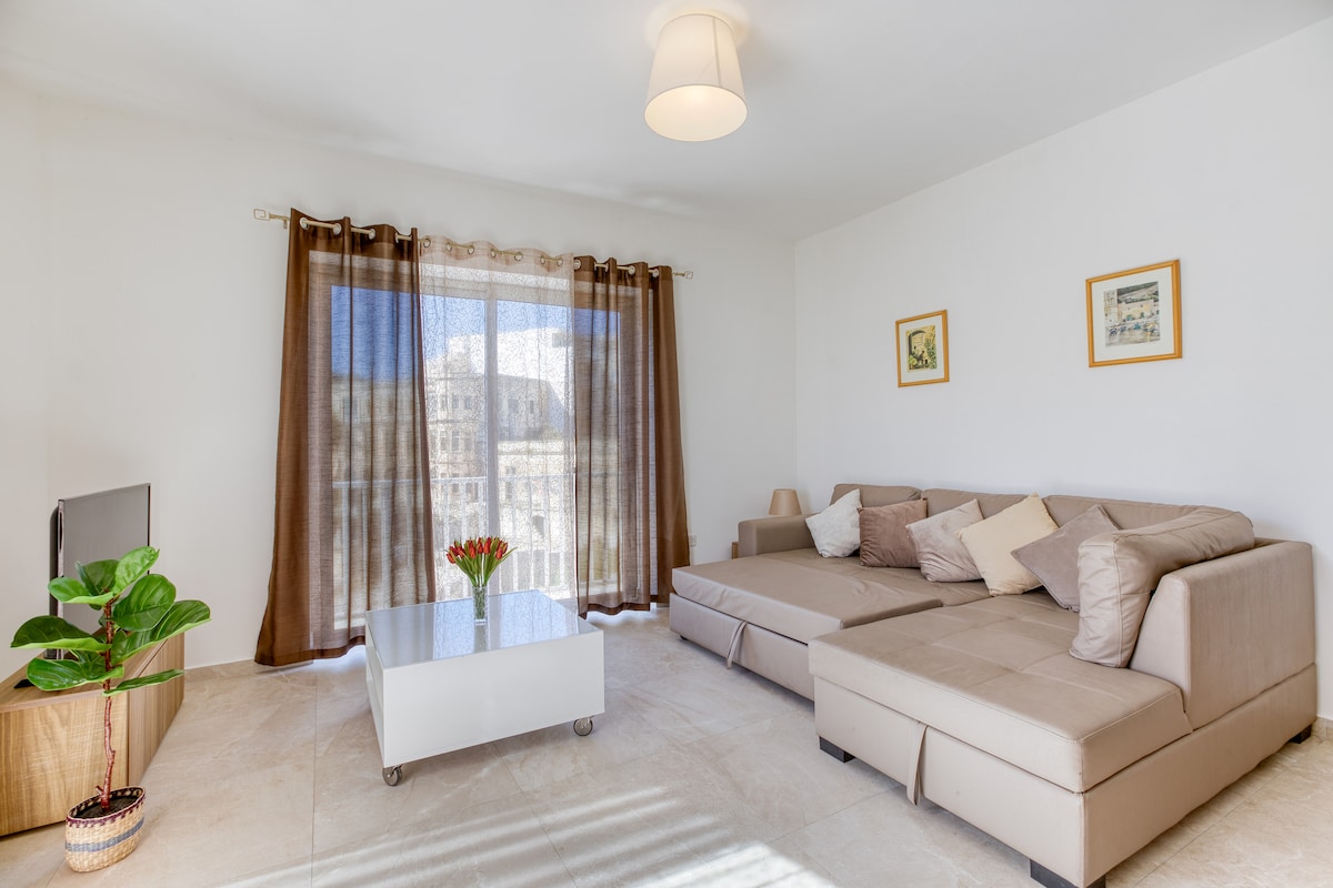 Stylish one-bedroom apartment in the hearth of Malta! Two minute walk from the seafront where you can find bus stops, restaurants and shops. The grocery store is literally next door! This cosy residence includes a balcony with city and harbour view, stylish living room and a fully equipped kitchen with electric hob, coffee machine, oven and dishwasher. The flat has air-conditioning (cold or hot), Wi-Fi, washing machine and essential home safety items.