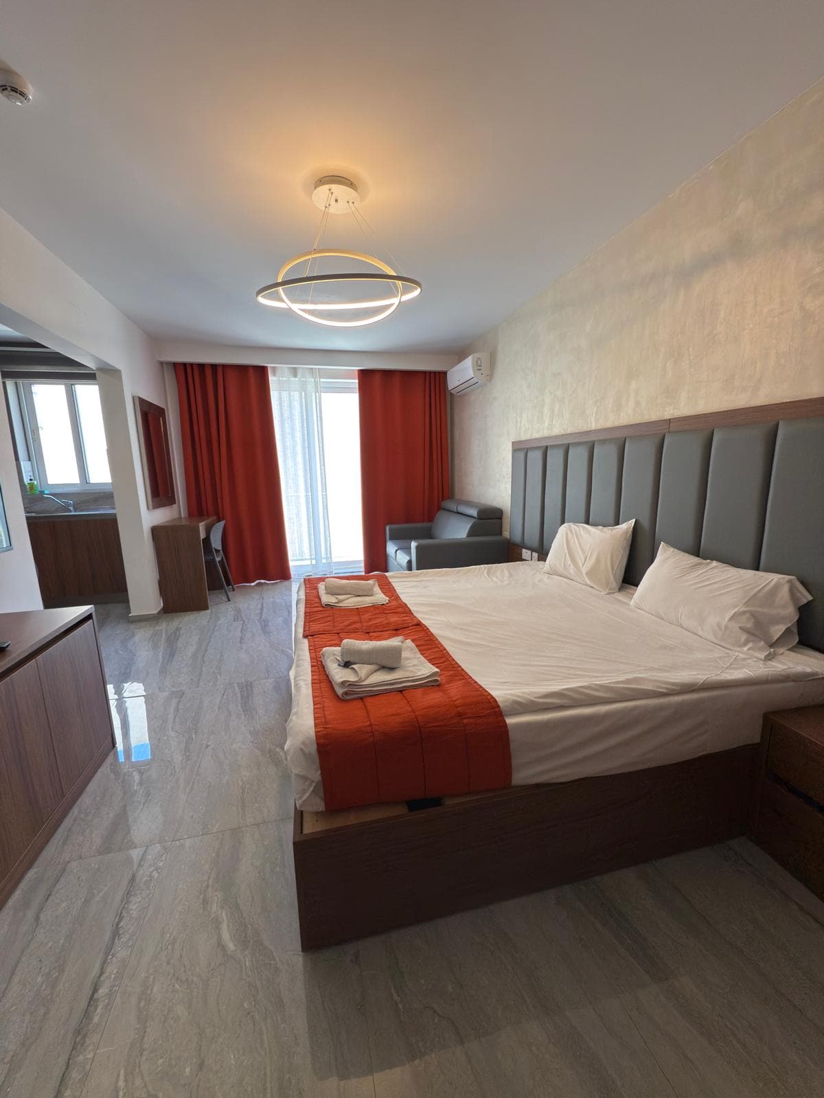 Enjoy a stylish experience at this centrally-located place. Located few minutes away from the seafront, beautiful beaches, restaurants, public transport, night life and bars. This modern 5th floor studio apartment comprises of an entrance area, fully equipped kitchen with breakfast bar and living area, king size bed, double wardrobe, workspace, large balcony and bathroom with shower. During your stay you will enjoy easy access to everything from this centrally located place.