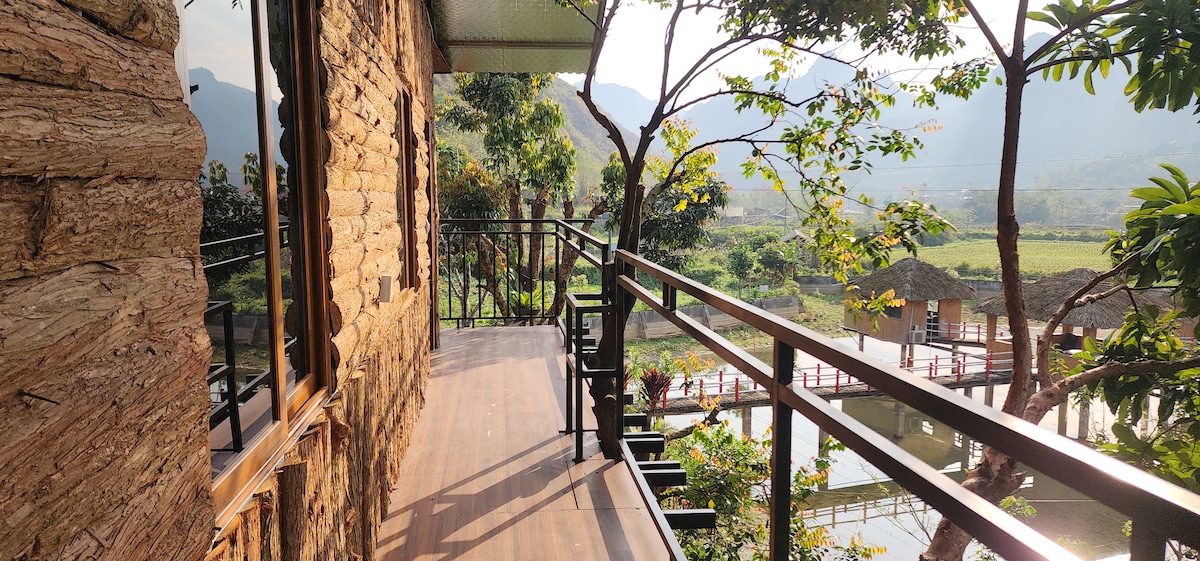 Private room with one double bed located on the second floor of a wooden house, offering beautiful panoramic views of the rice fields and surrounding mountains. A peaceful and cozy space, ideal for couples or solo travelers who want to relax and enjoy nature. Guests can also use the shared amenities of the guest house, including the swimming pool, pool table, bar and two karaoke rooms.