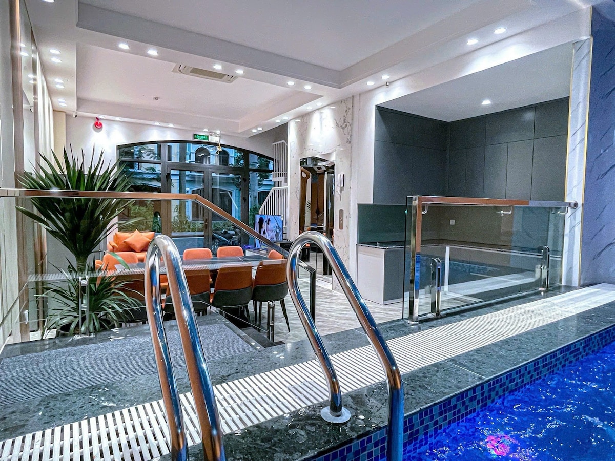 Your private coastal villa in the heart of Ha Long—steps from the beach and cafés. 6 en-suite bedrooms, private saltwater pool and lush garden set the tone for easy living. Soak in the jacuzzi, detox in the Finnish sauna, then gather in the lounge or cook easy feasts in a fully equipped kitchen. Families love the Kids’ Room; an elevator reaches every floor, including the spa room and laundry. Minutes to Sun World, night market & cruise piers. Free Wi-Fi & parking. Private BBQ patio for cookouts.