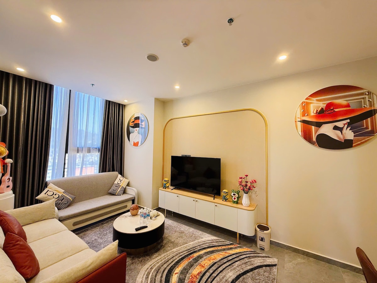 Luxury apartment à la carte Ha Long - the highest 41 floor building in Ha Long, the apartment on the 32nd floor has 2 bedrooms and a living room with glass ocean views, at the foot of the building is a white sand beach, 5-stars standard room facilities are fragrant and clean, suitable for families with young children or groups of friends who want to have a common space when traveling but still need a private, closed bedroom, especially when traveling. Watch the sea 24/24 even lying on your bed