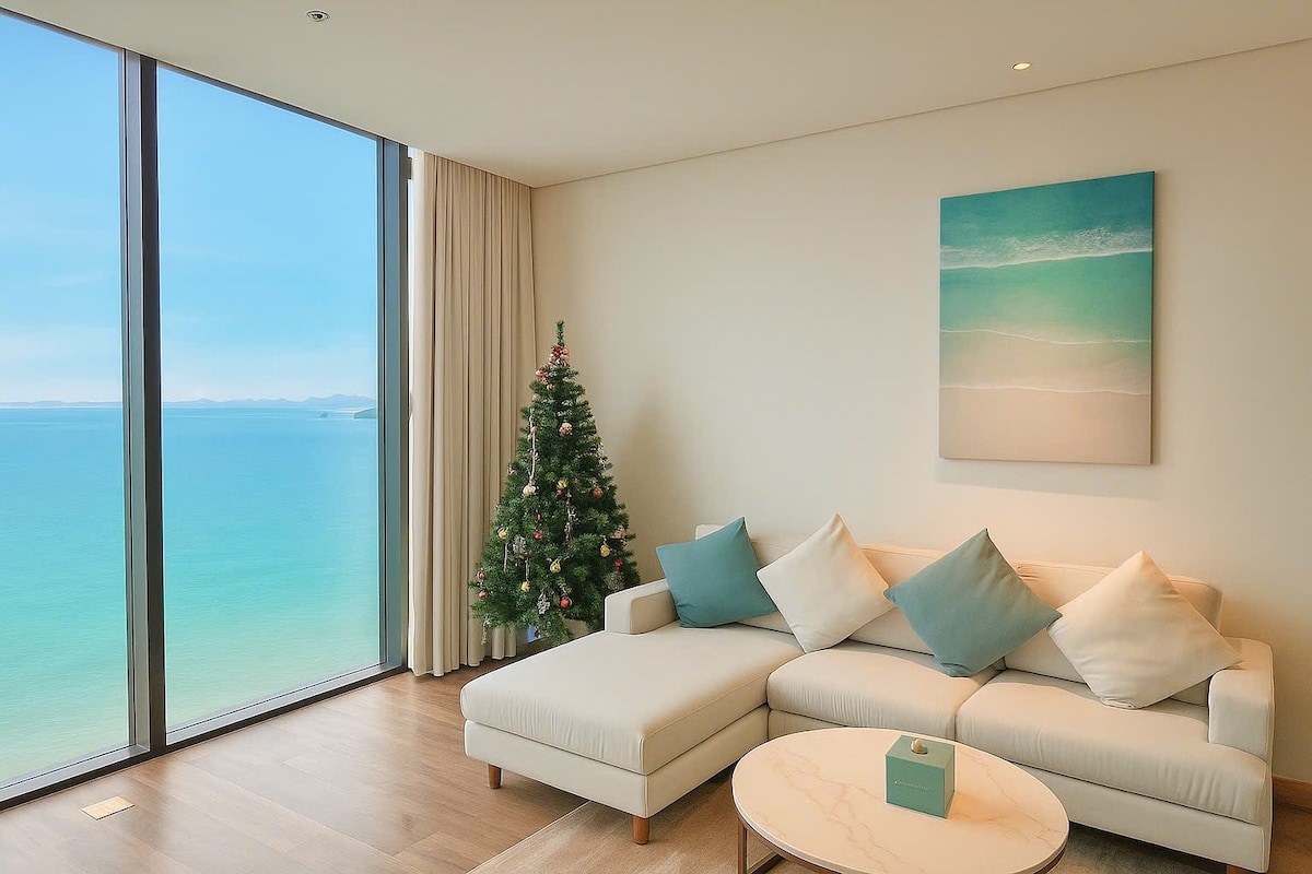 - Điểm nhấn chính là phòng hướng biển nơi bạn có thể nhâm nhi ly cà phê buổi sáng, ngắm bình minh rực rỡ hay thư giãn cùng hoàng hôn lãng mạn trên biển. - Căn hộ gồm 1 phòng ngủ, phòng khách liên thông bếp và thích hợp cho cặp đôi hoặc gia đình nhỏ. Nội thất tiện nghi: điều hòa, wifi tốc độ cao, smart TV, bếp nấu,… mang đến cảm giác thoải mái như ở nhà nhưng vẫn trọn vẹn trải nghiệm nghỉ dưỡng. - Vị trí ngay cạnh bãi biển – chỉ vài phút đi bộ, bạn đã có thể hòa mình vào làn nước trong xanh.